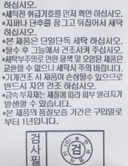 | 세탁방법 및 취급시 주의사항 | 중성세제로 단 시간내에 세탁하십시오.(케어라벨참고) |