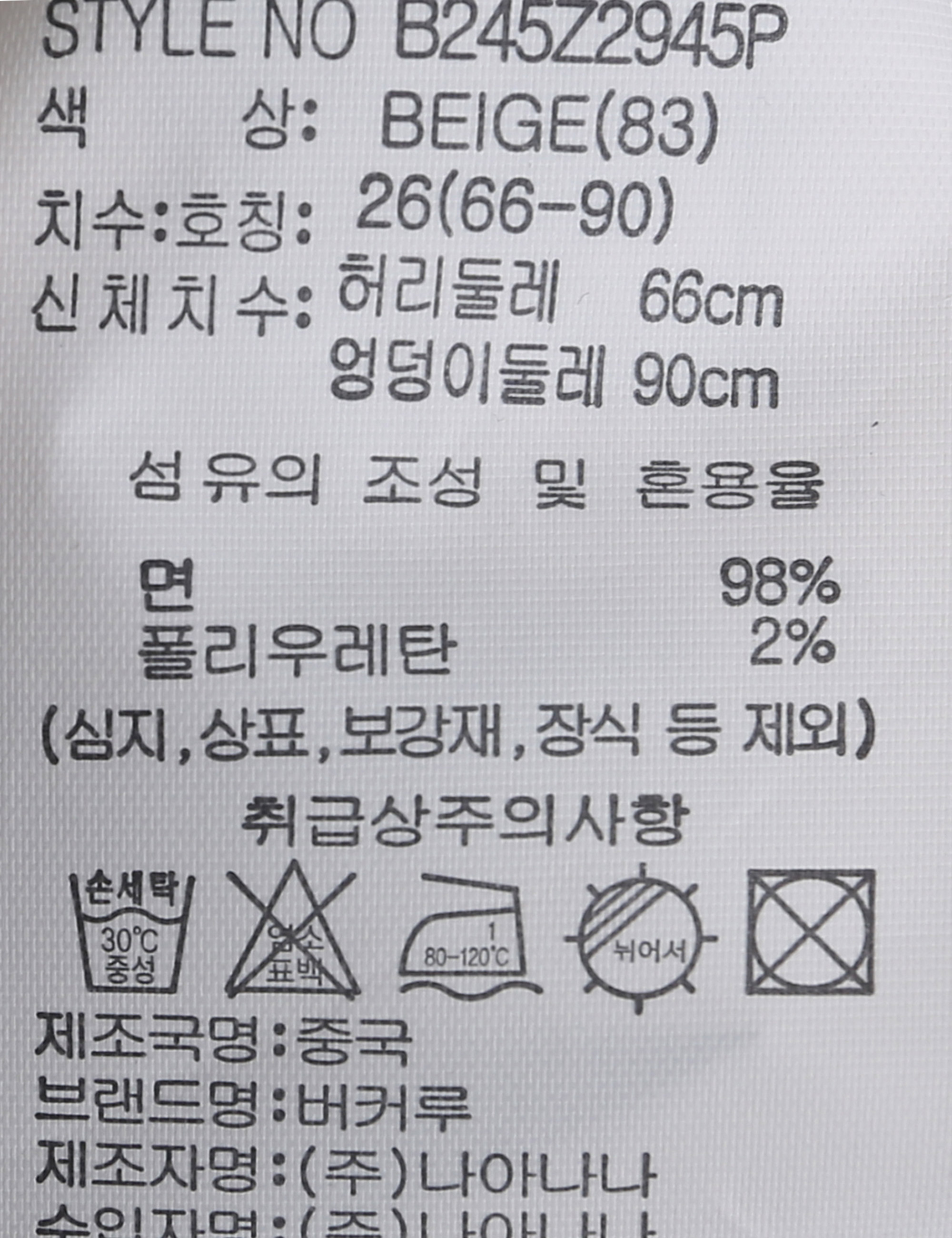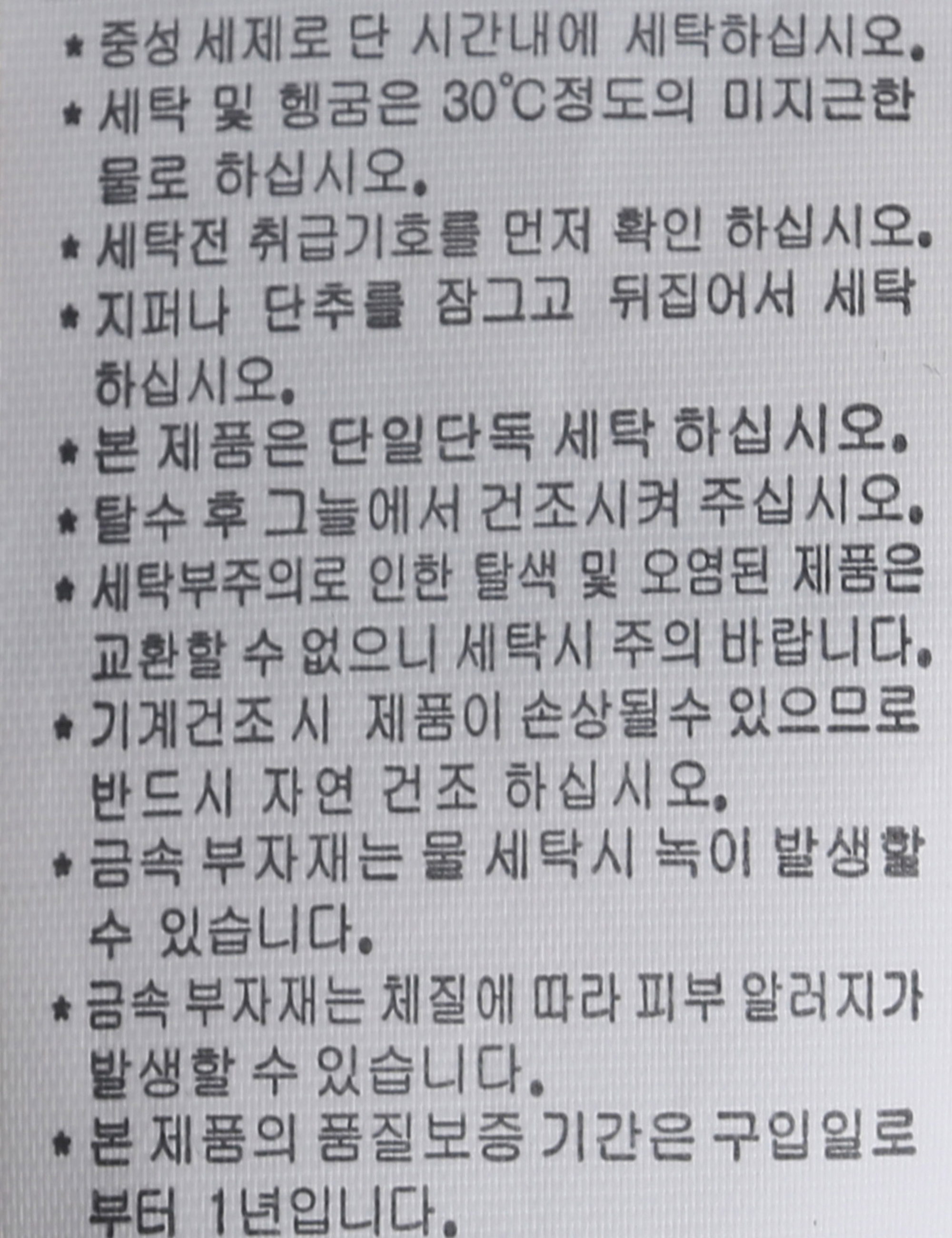 | 세탁방법 및 취급시 주의사항 | 본 제품은 손세탁 하십시오.(케어라벨참고) |
