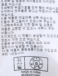 | 세탁방법 및 취급시 주의사항 | 중성세제로 단 시간내에 세탁하십시오.(케어라벨참고) |