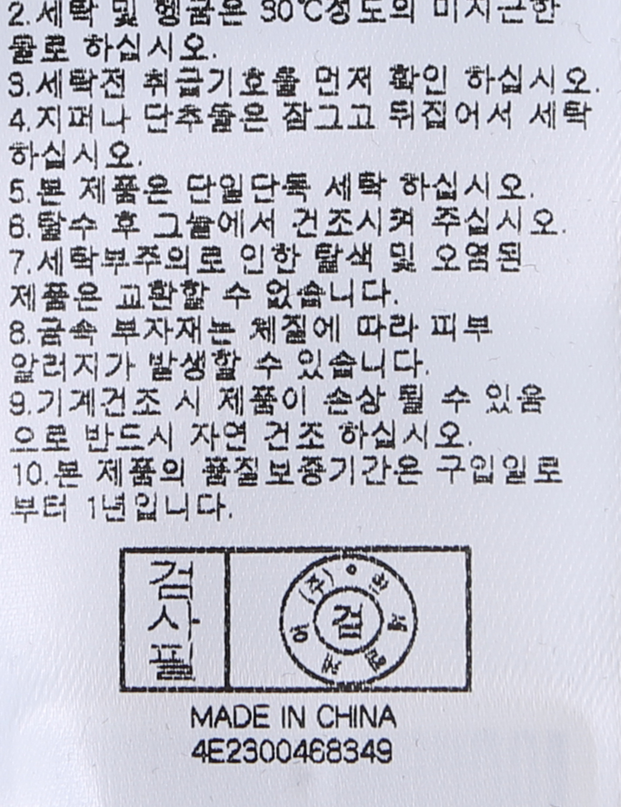 | 세탁방법 및 취급시 주의사항 | 중성세제로 단 시간내에 세탁하십시오.(케어라벨참고) |