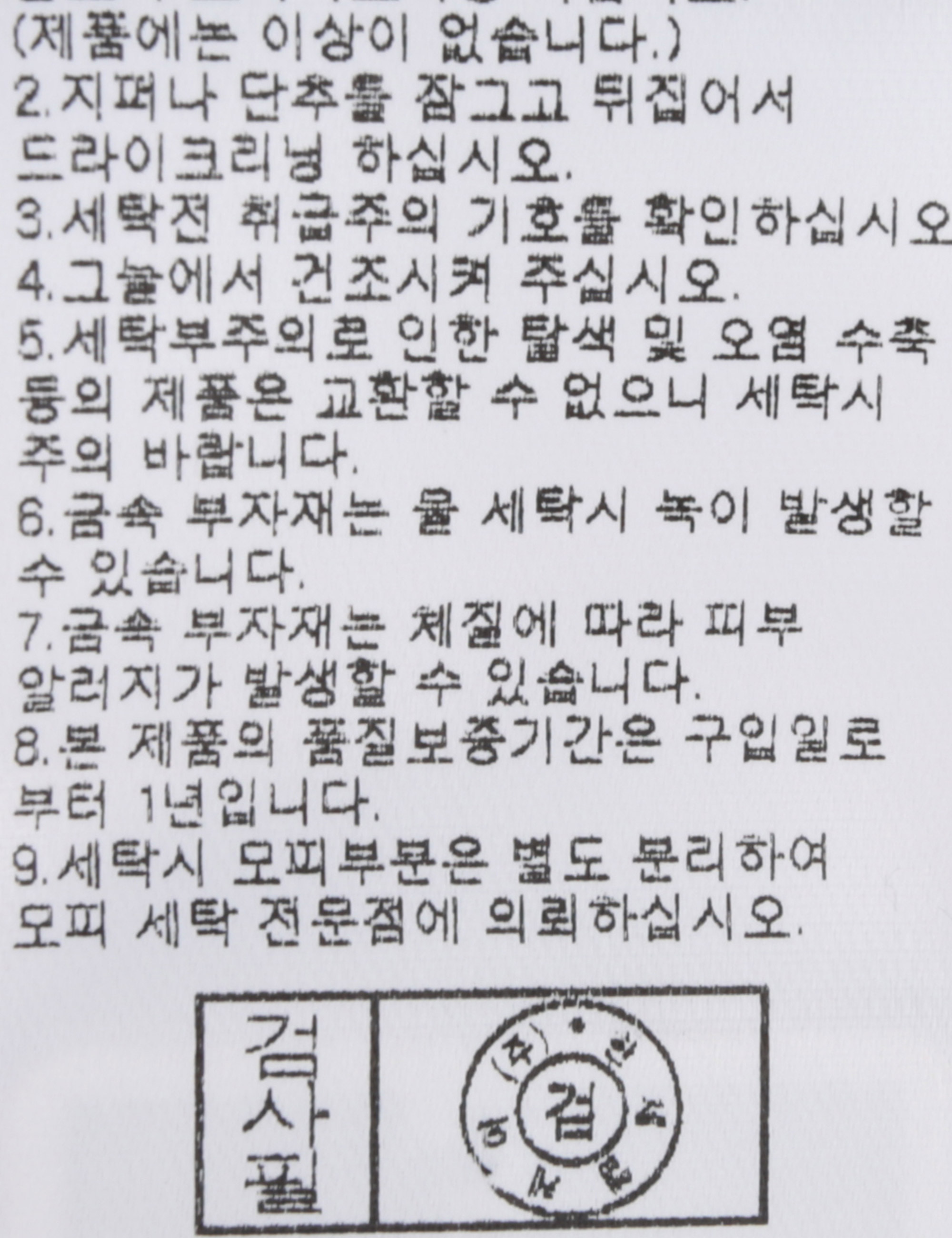 | 세탁방법 및 취급시 주의사항 | 본 제품은 반드시 드라이크리닝 하십시오.(세탁라벨참고) |