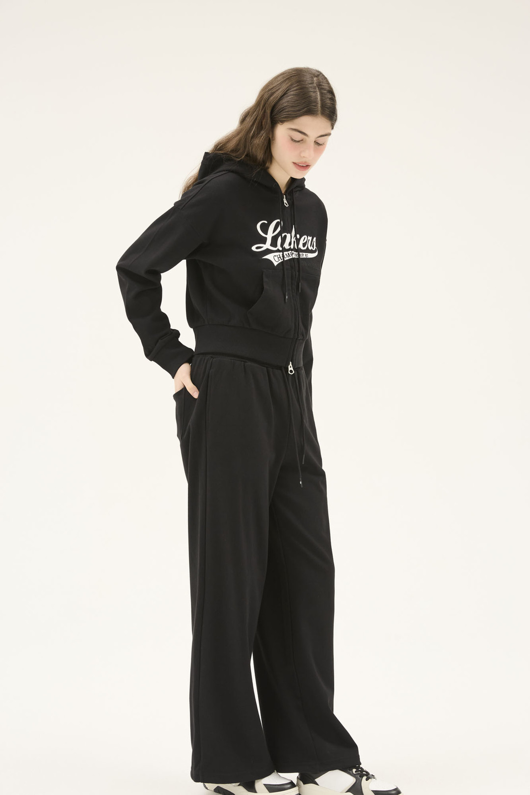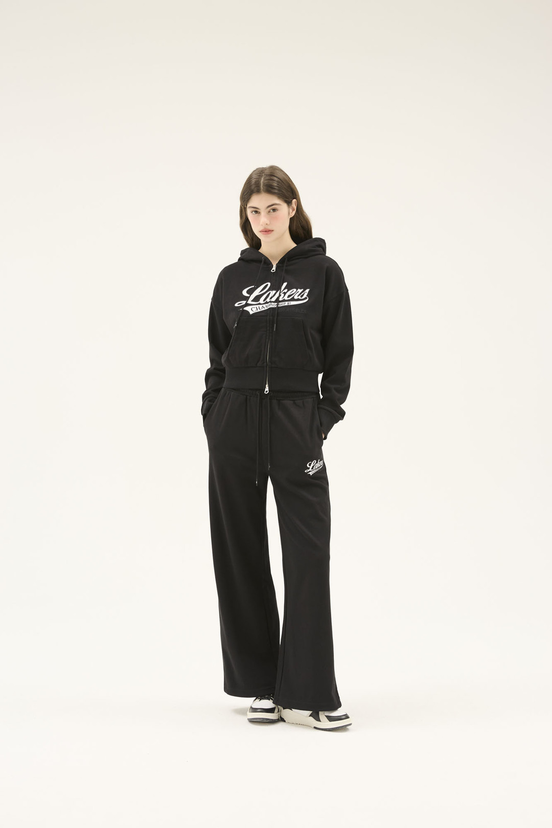 팀 스몰 로고 자수가 포인트이며, 어디에나 코디 가능하여 편하게 착용하기 좋은 와이드 팬츠 스타일