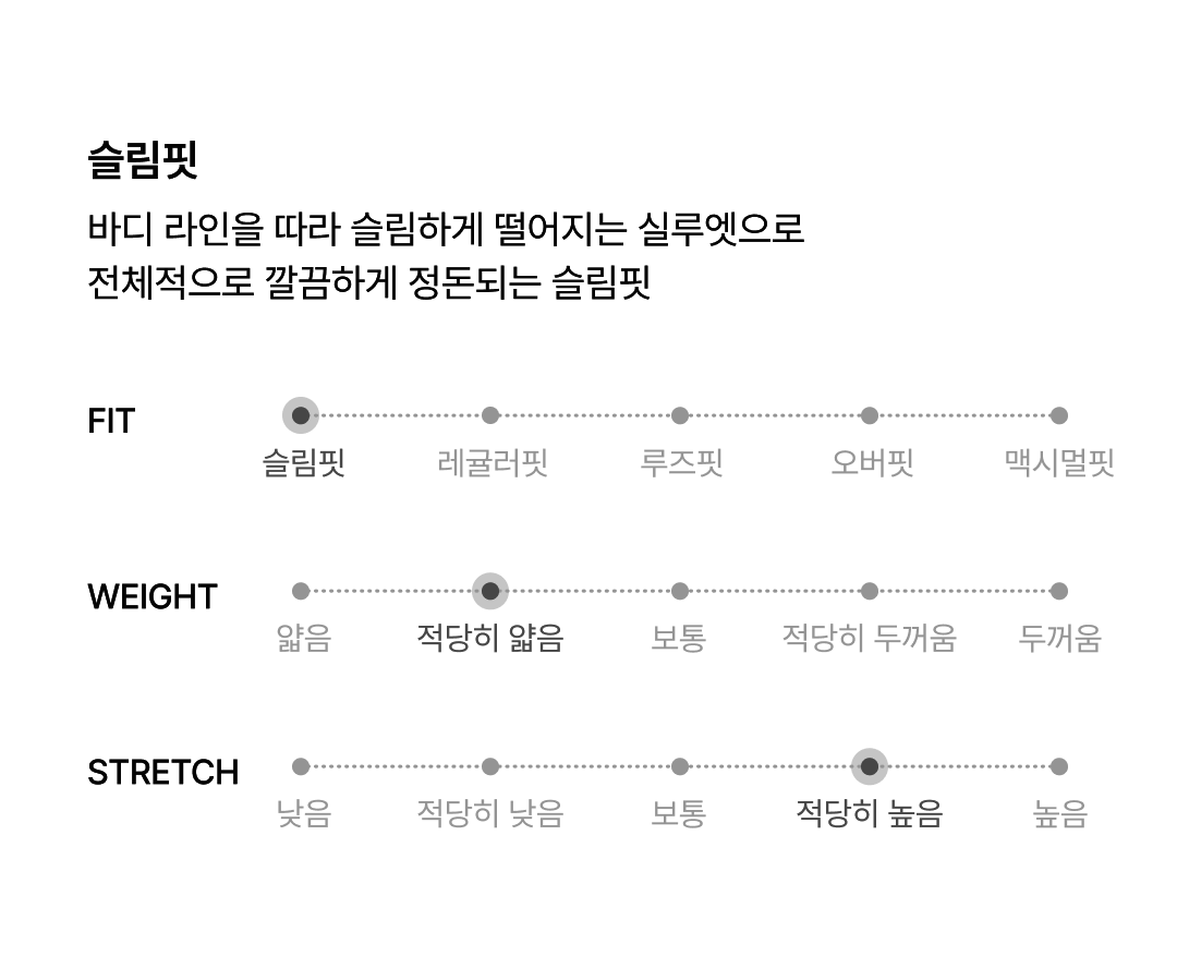 두께 적당히 얇음 / 신축성 적당히 높음 / 비침 없음 몸의 실루엣을 잡아주는 슬림한 라인이므로 정사이즈 선택 시 세련된 연출 가능