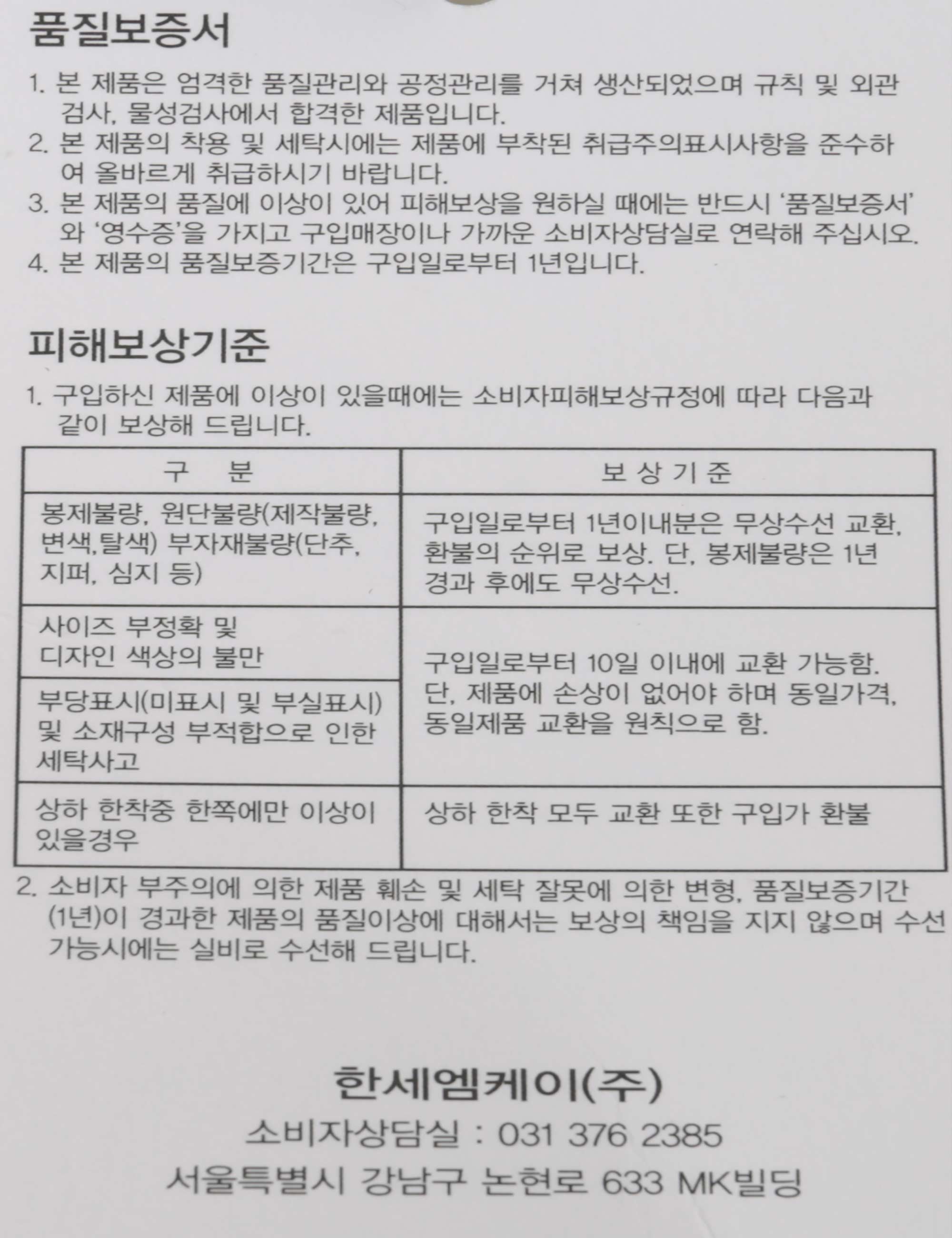 | 제조사 | 한세엠케이(주) |