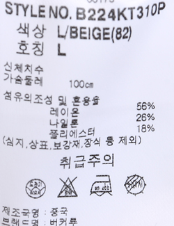 | 세탁방법 및 취급시 주의사항 | 본 제품은 반드시 드라이크리닝 하십시오.(세탁라벨참고) |