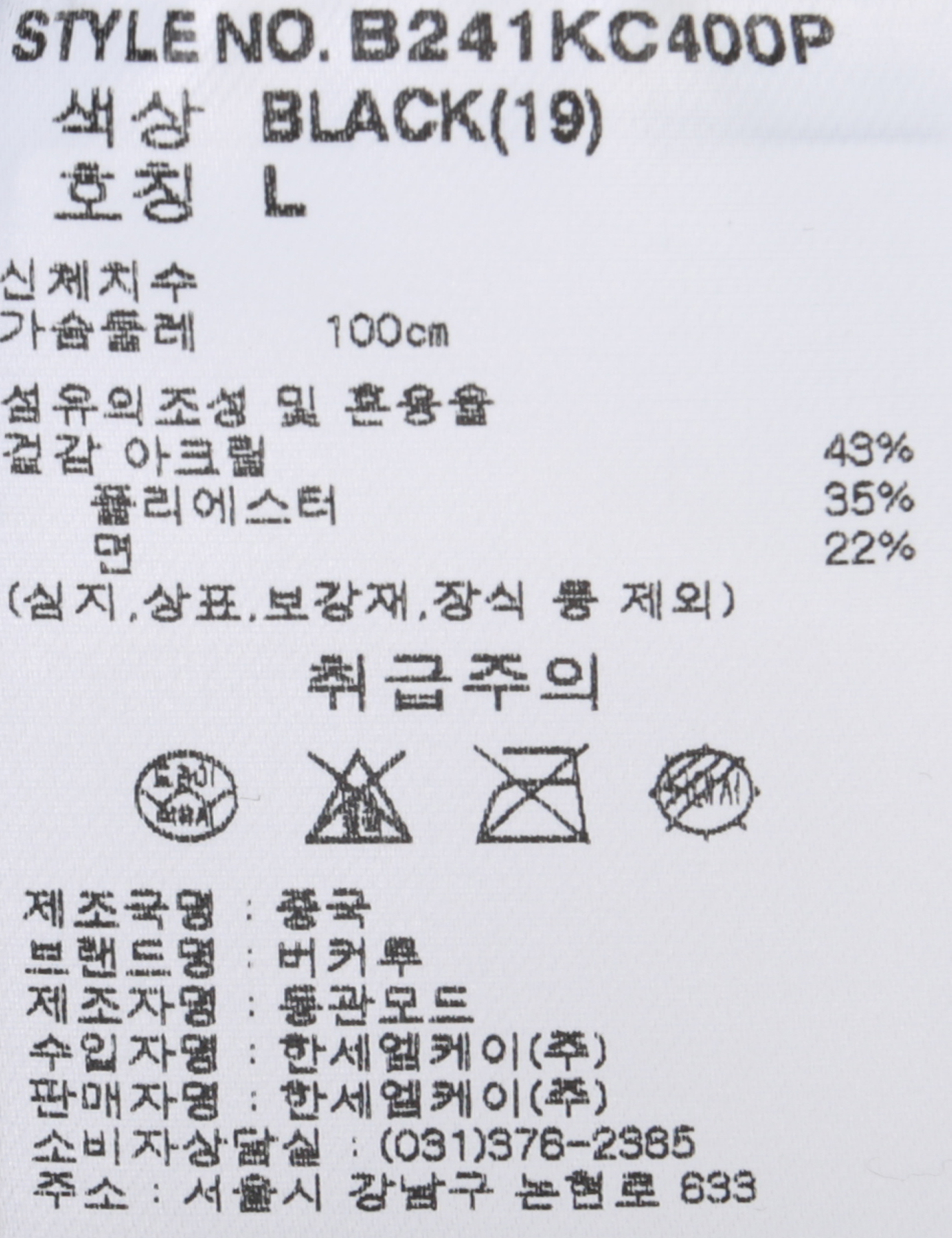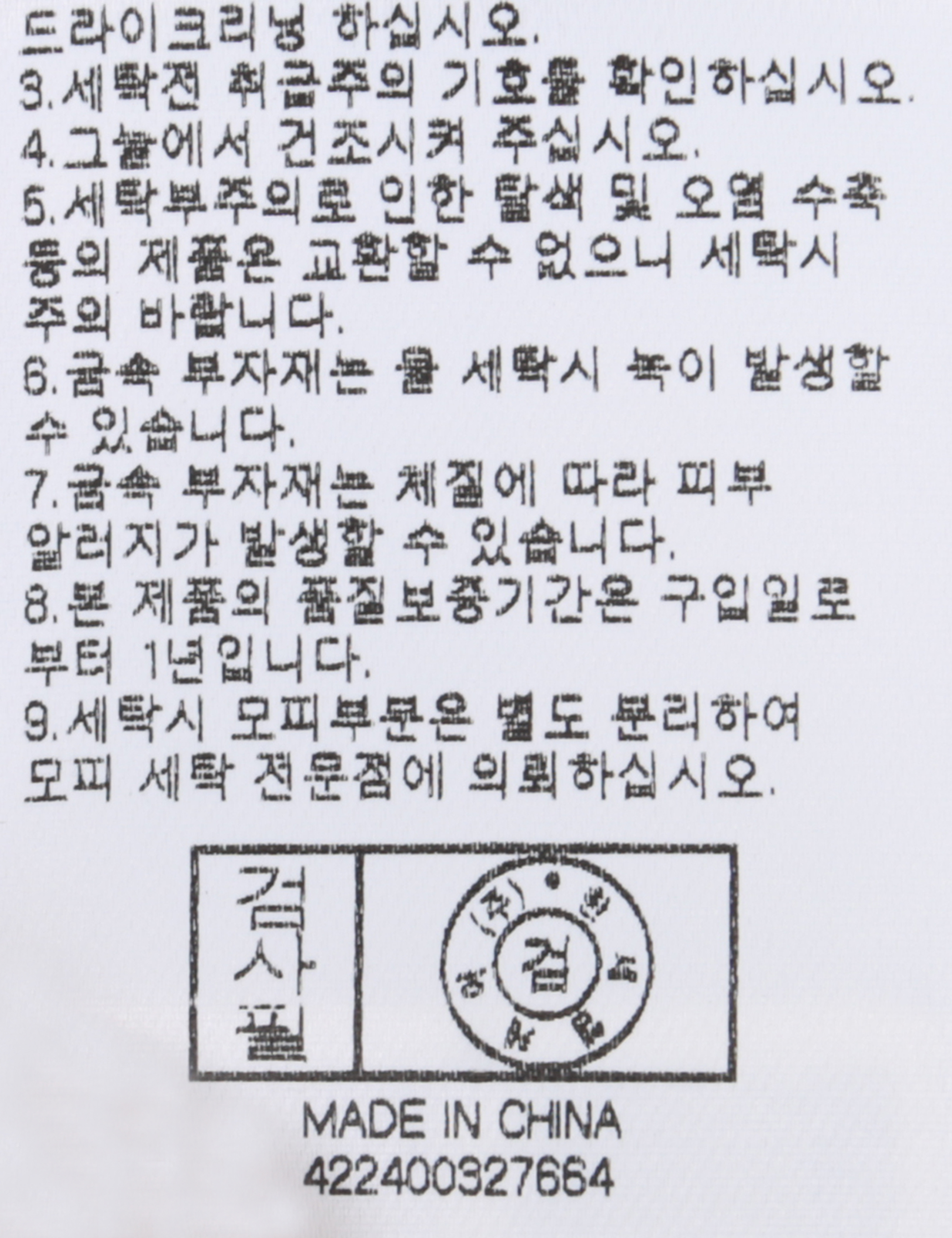 | 세탁방법 및 취급시 주의사항 | 본 제품은 반드시 드라이크리닝 하십시오.(세탁라벨참고) |