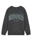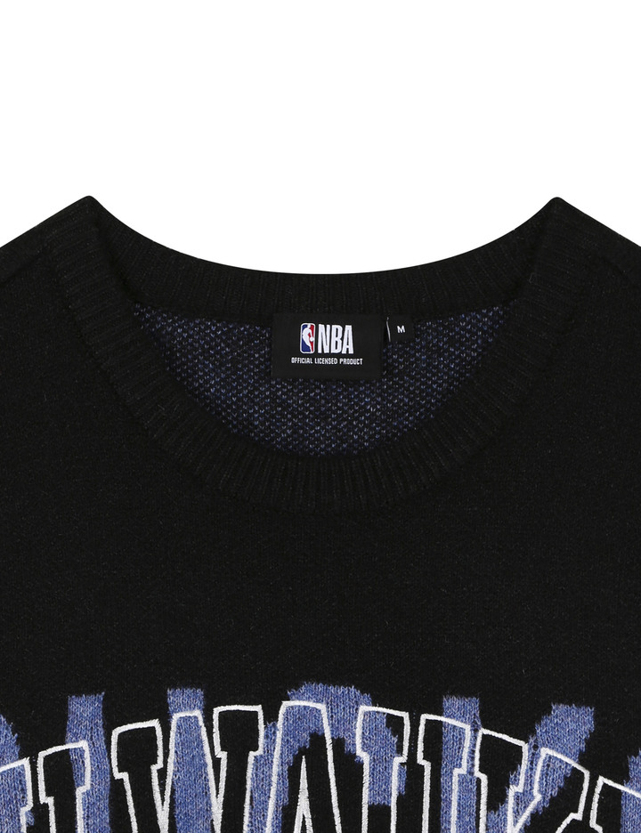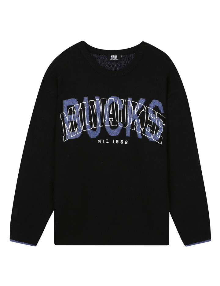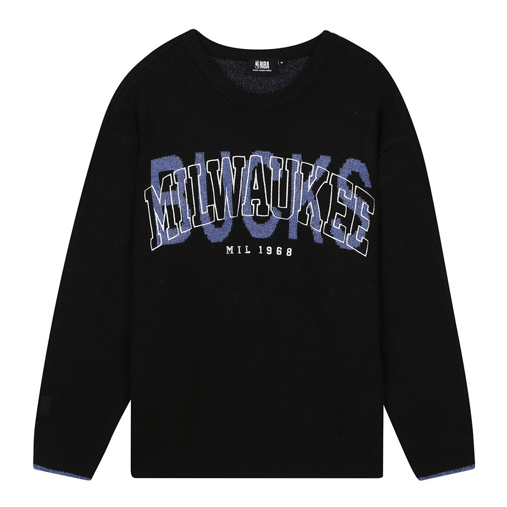 스판사가 있는 니트 원사를 사용한 니트 풀오버 스타일로 컬러별 팀별 로고를 자수와 매치하여 포인트를 준 스타일
