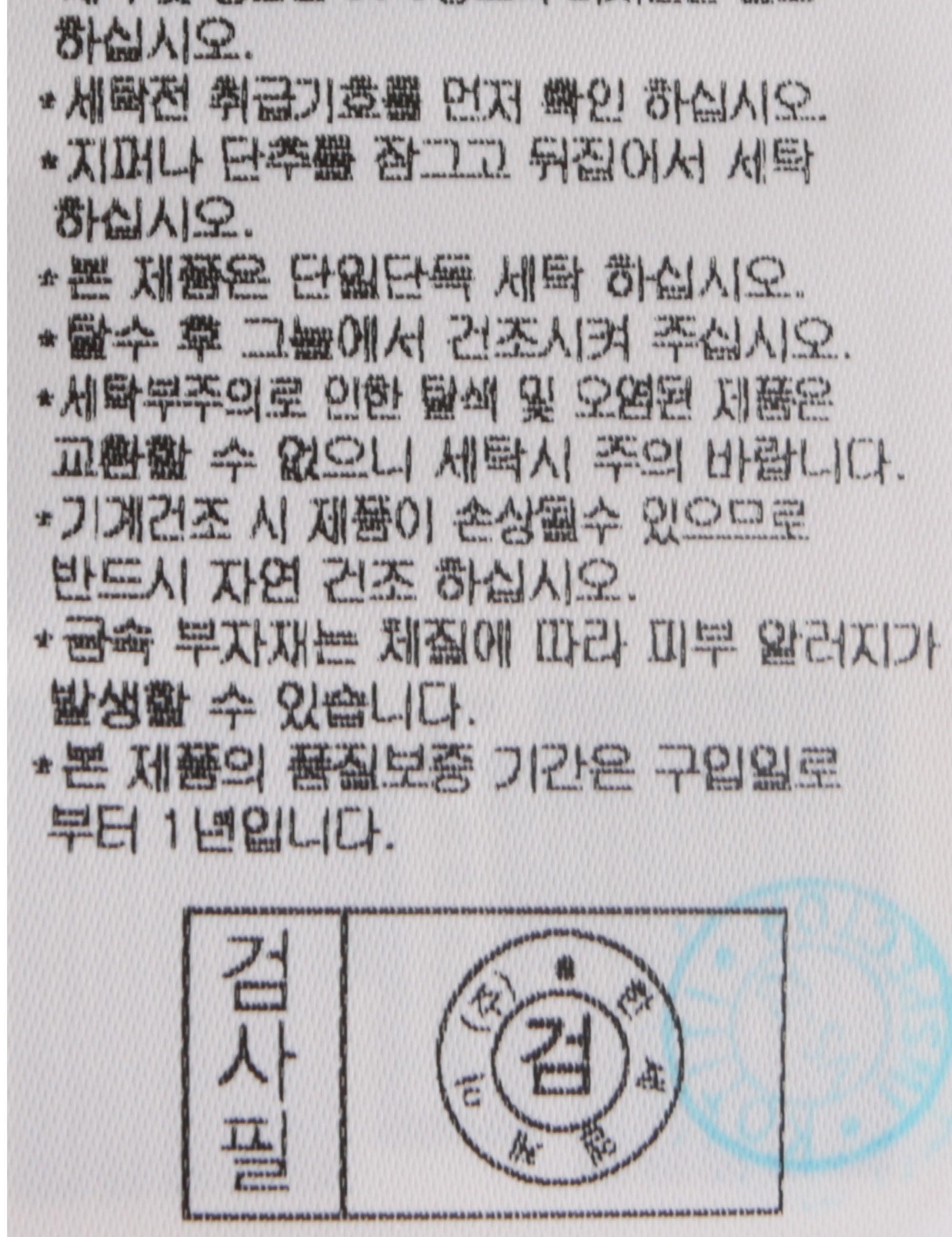 | 세탁방법 및 취급시 주의사항 | 중성세제로 단 시간내에 세탁하십시오.(케어라벨참고) |