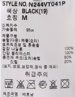 브랜드 홈 바로가기| 제품소재 | [겉감]나일론100% [안감]폴리에스터100% [충전재]우모(오리)솜털80% 깃털20% |