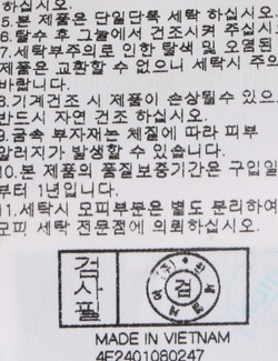 | 세탁방법 및 취급시 주의사항 | 중성세제로 단 시간내에 세탁하십시오.(케어라벨참고) |