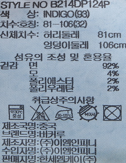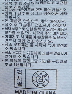 | 세탁방법 및 취급시 주의사항 | 중성세제로 단 시간내에 세탁하십시오.(케어라벨참고) |