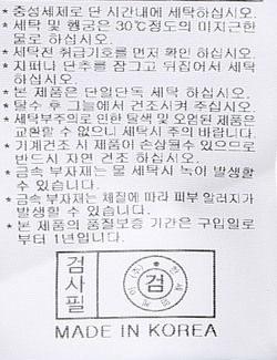 | 세탁방법 및 취급시 주의사항 | 중성세제로 단 시간내에 세탁하십시오.(케어라벨참고) |