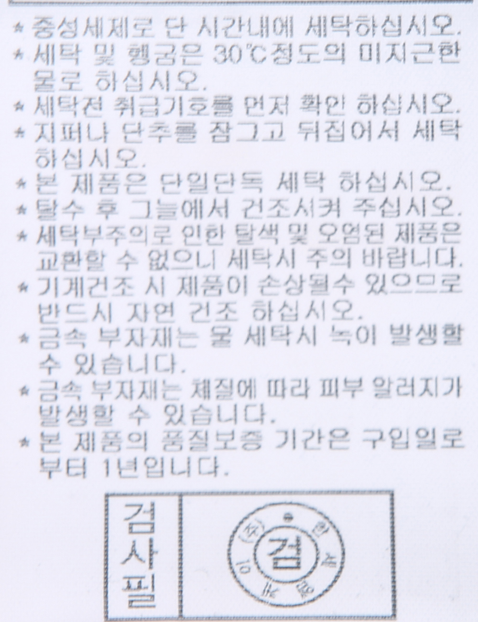 | 세탁방법 및 취급시 주의사항 | 중성세제로 단 시간내에 세탁하십시오.(케어라벨참고) |