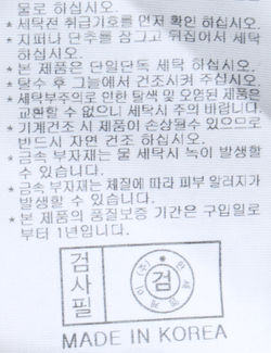 | 세탁방법 및 취급시 주의사항 | 중성세제로 단 시간내에 세탁하십시오.(케어라벨참고) |