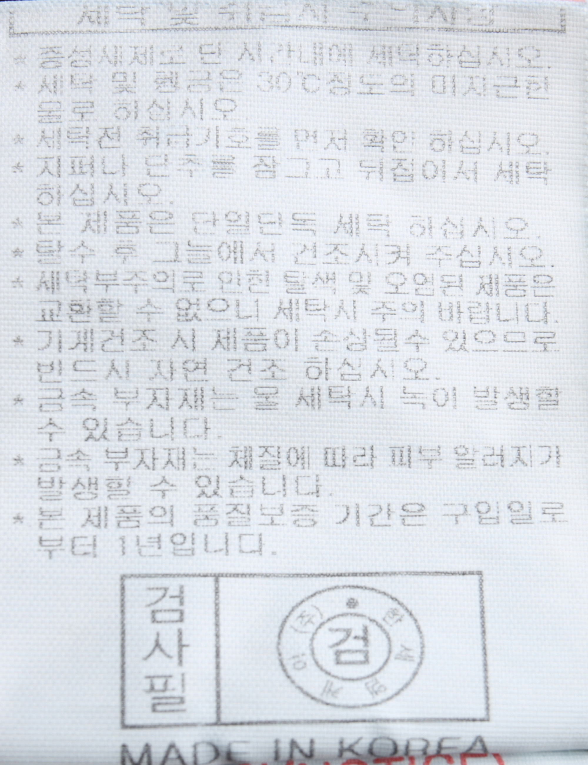 | 세탁방법 및 취급시 주의사항 | 중성세제로 단 시간내에 세탁하십시오.(케어라벨참고) |