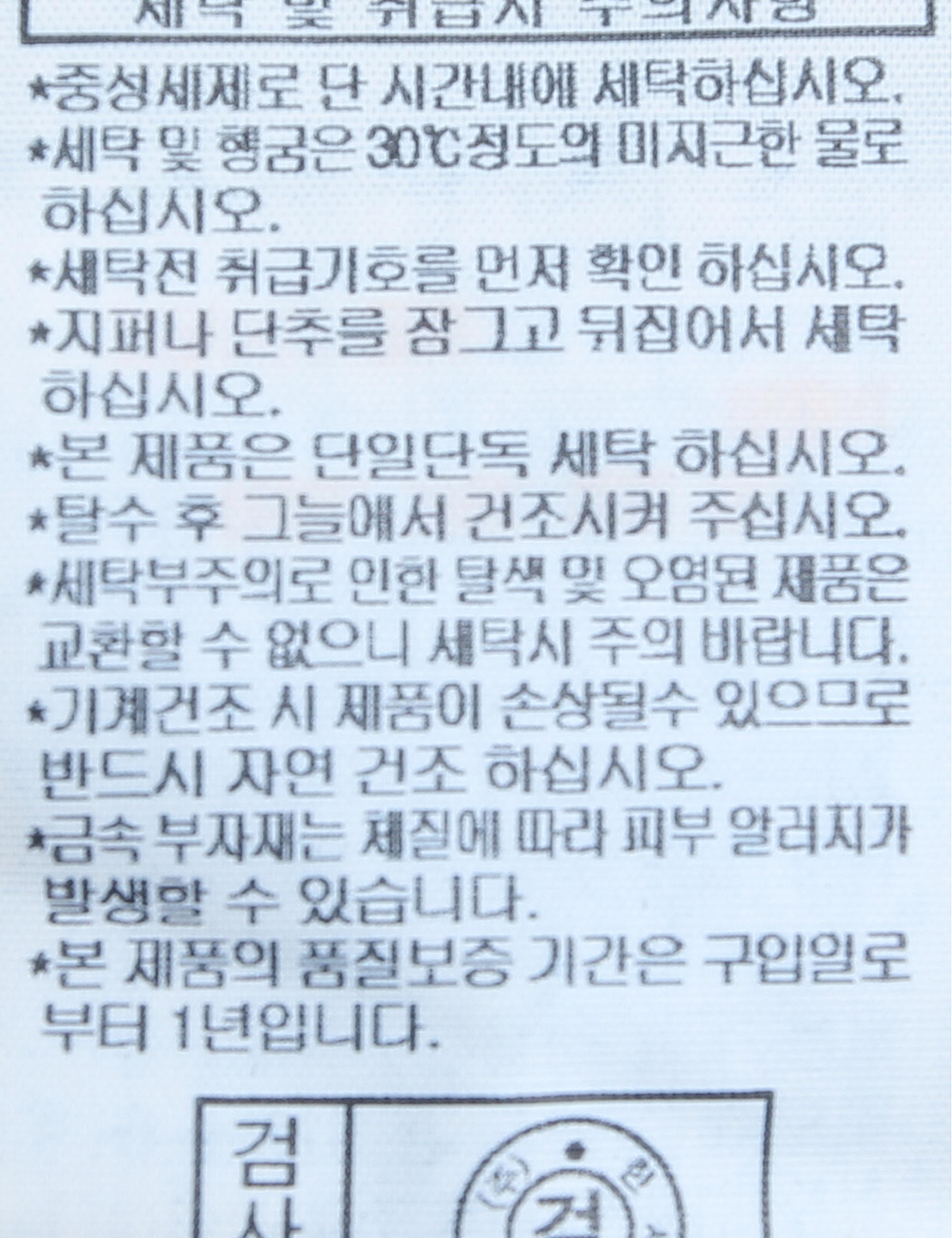 | 세탁방법 및 취급시 주의사항 | 중성세제로 단 시간내에 세탁하십시오.(케어라벨참고) |