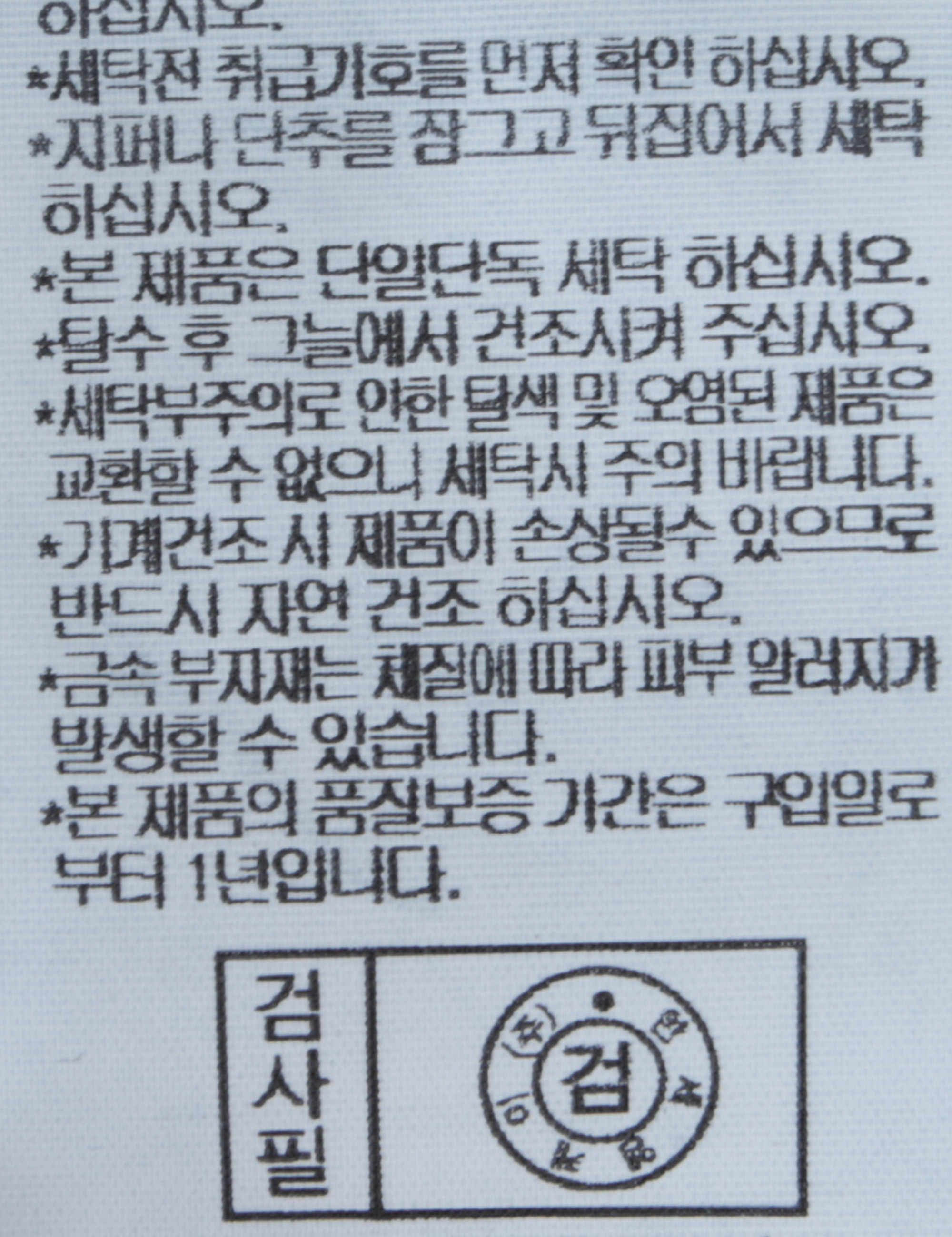 | 세탁방법 및 취급시 주의사항 | 중성세제로 단 시간내에 세탁하십시오.(케어라벨참고) |
