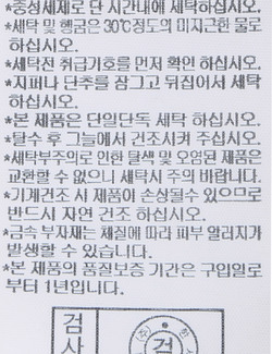 | 세탁방법 및 취급시 주의사항 | 중성세제로 단 시간내에 세탁하십시오.(케어라벨참고) |