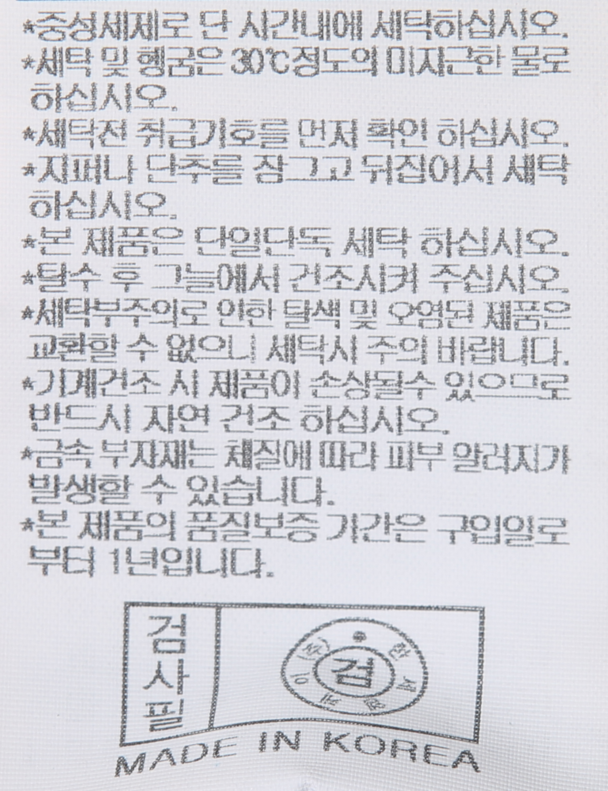 | 세탁방법 및 취급시 주의사항 | 중성세제로 단 시간내에 세탁하십시오.(케어라벨참고) |