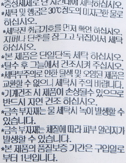 | 세탁방법 및 취급시 주의사항 | 본 제품은 손세탁 하십시오.(케어라벨참고) |