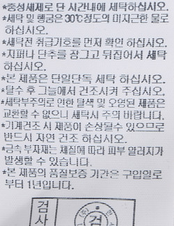 | 세탁방법 및 취급시 주의사항 | 중성세제로 단 시간내에 세탁하십시오.(케어라벨참고) |