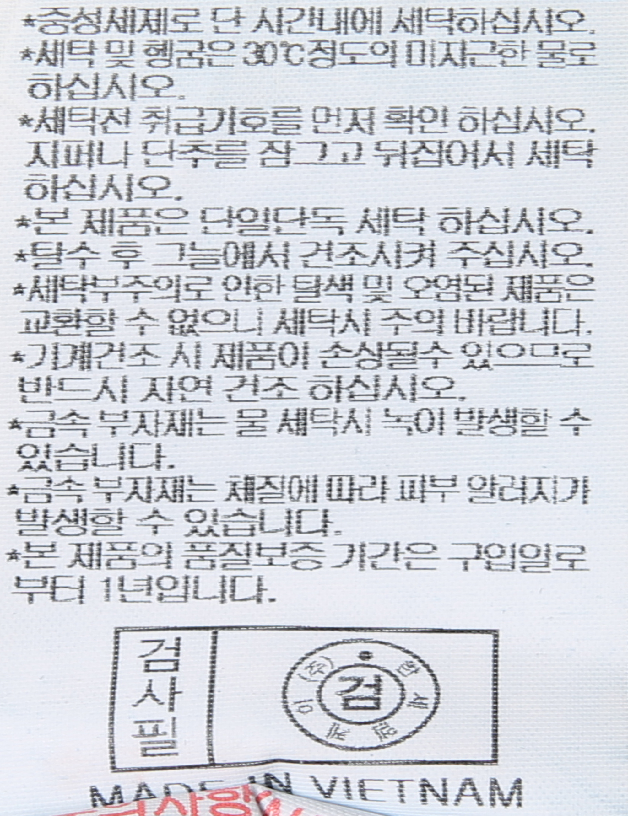 | 세탁방법 및 취급시 주의사항 | 본 제품은 손세탁 하십시오.(케어라벨참고) |
