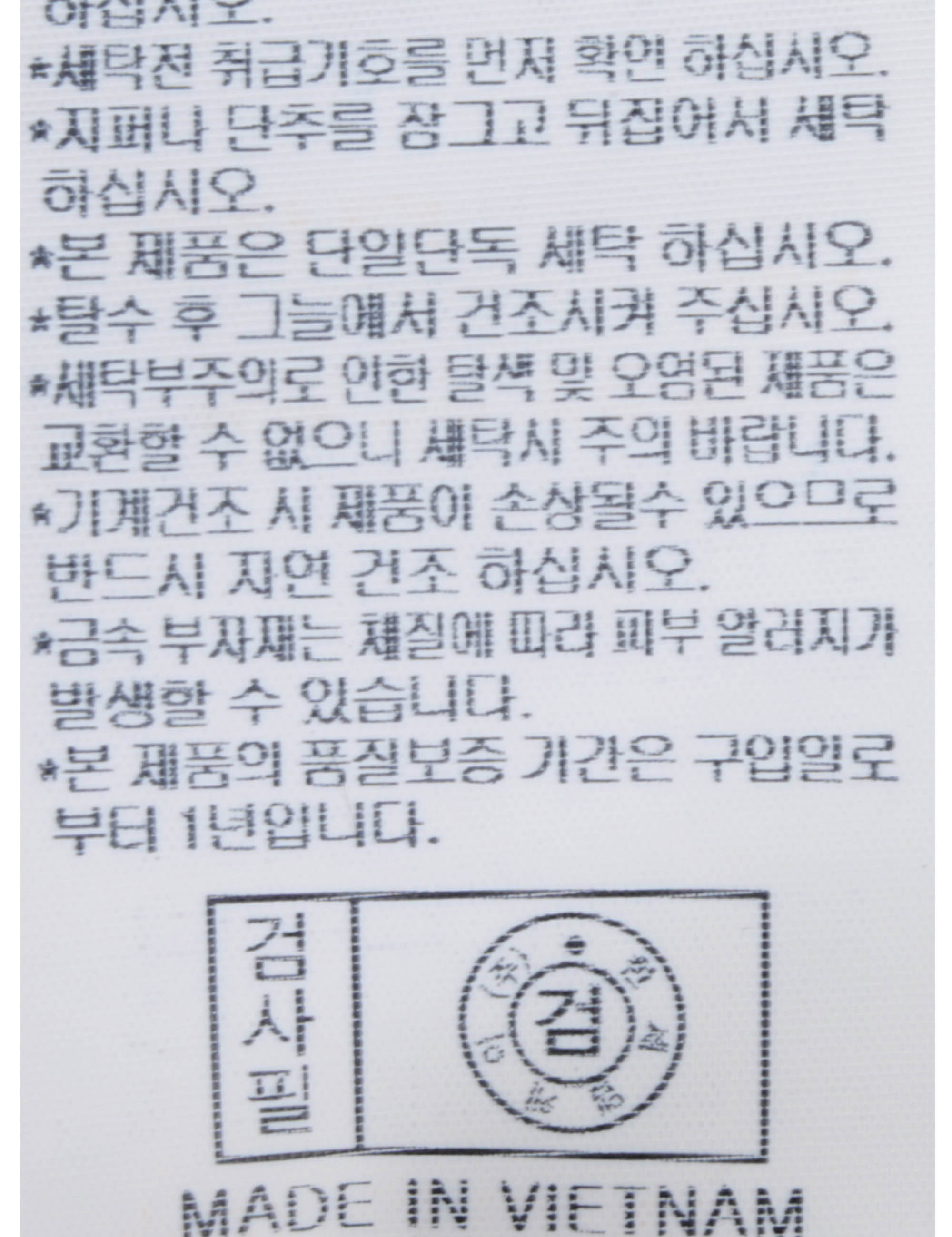 | 세탁방법 및 취급시 주의사항 | 중성세제로 단 시간내에 세탁하십시오.(케어라벨참고) |