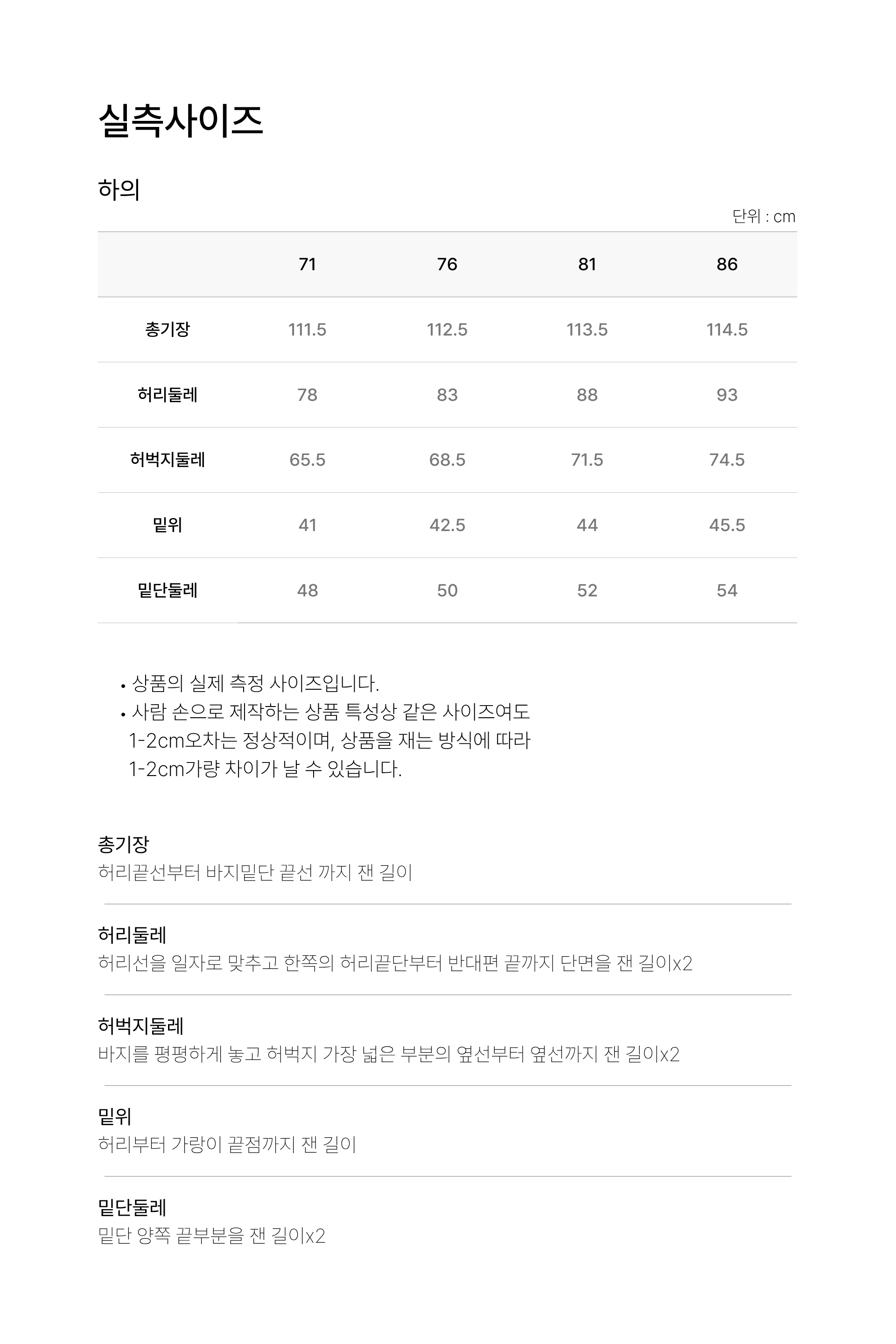 두께 보통 / 신축성 낮음 여유 있는 와이드 핏으로 편안하면서도 안정적인 실루엣입니다.