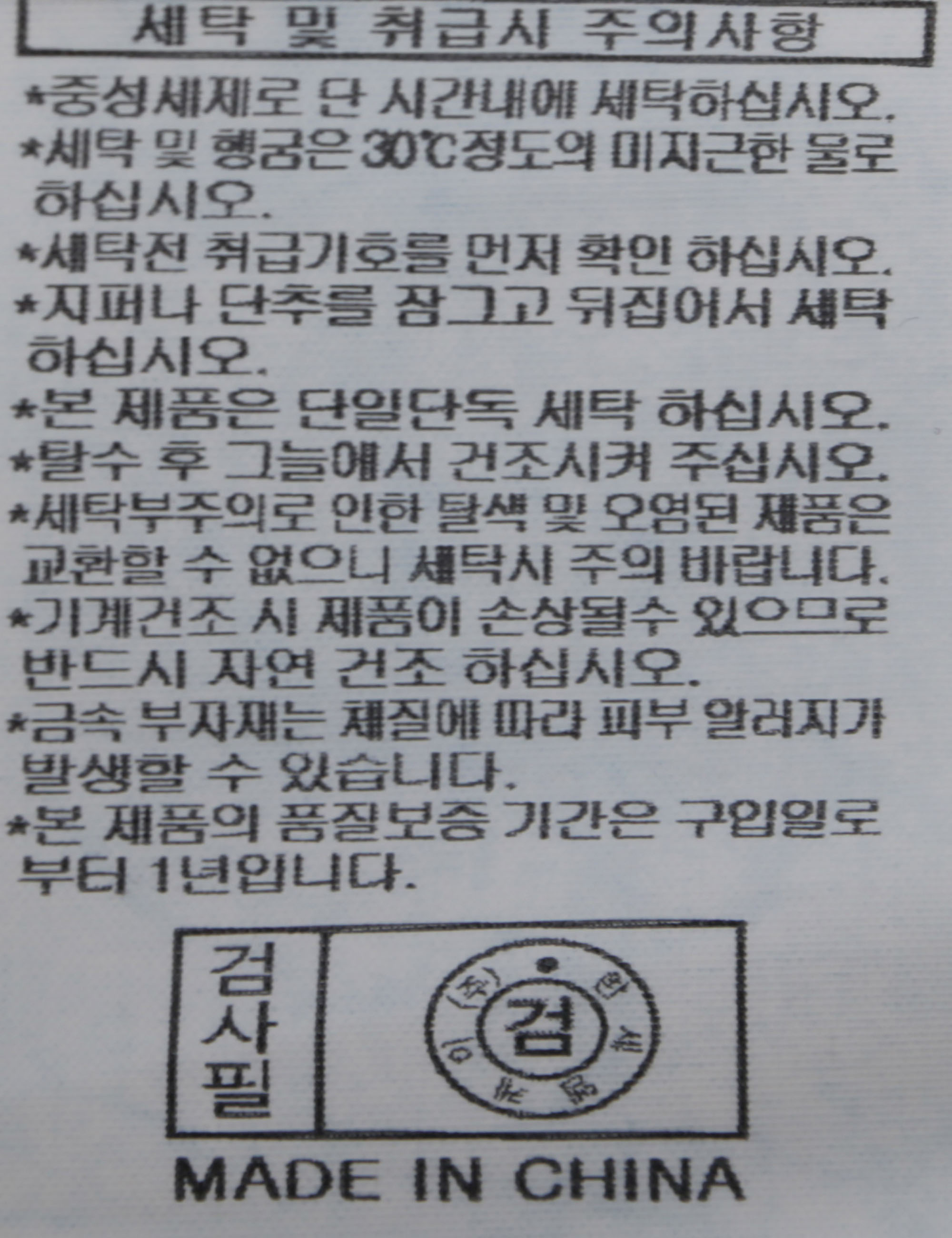 세탁방법 및 취급시 주의사항 중성세제로 단 시간내에 세탁하십시오.(케어라벨참고)
