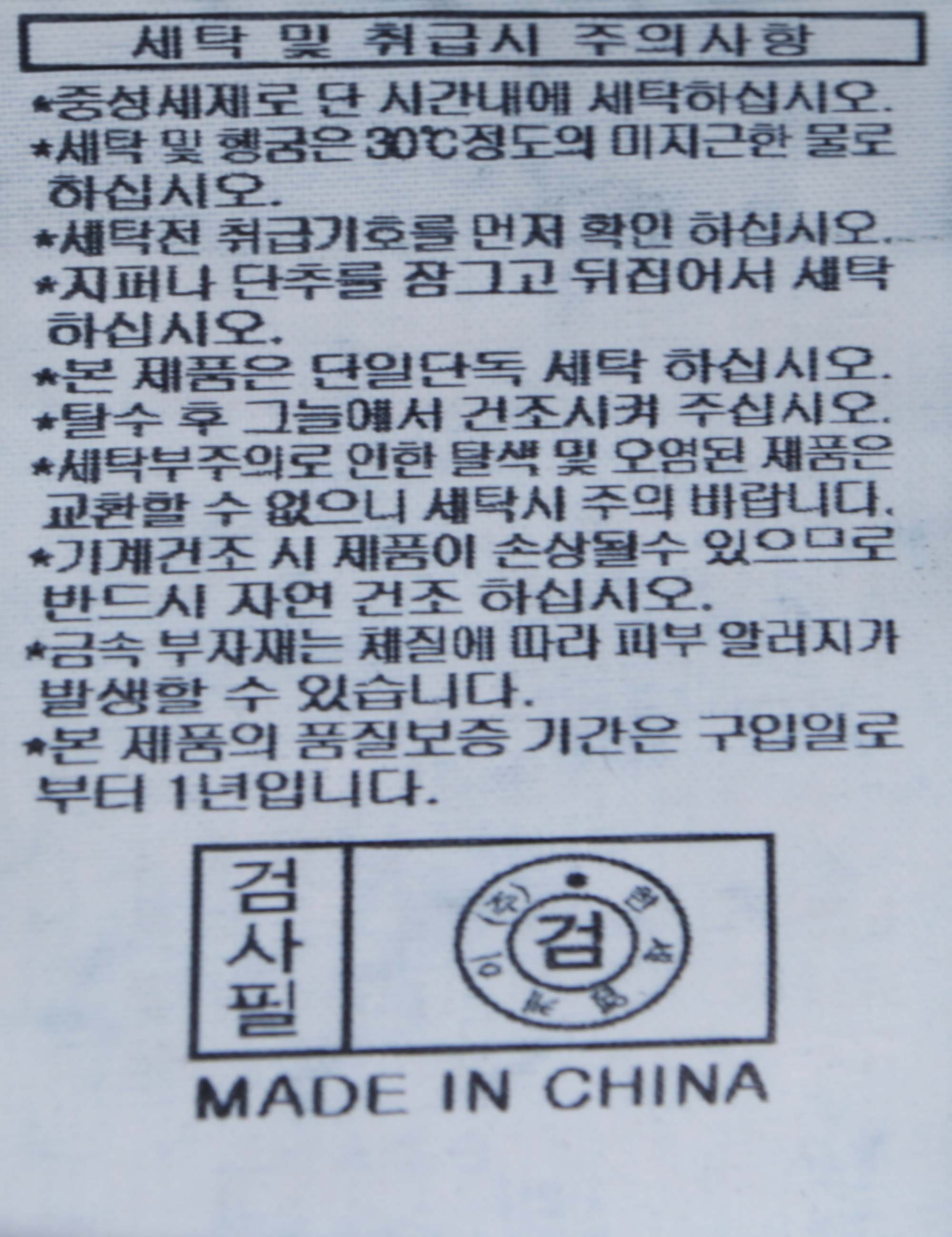 | 세탁방법 및 취급시 주의사항 | 중성세제로 단 시간내에 세탁하십시오.(케어라벨참고) |