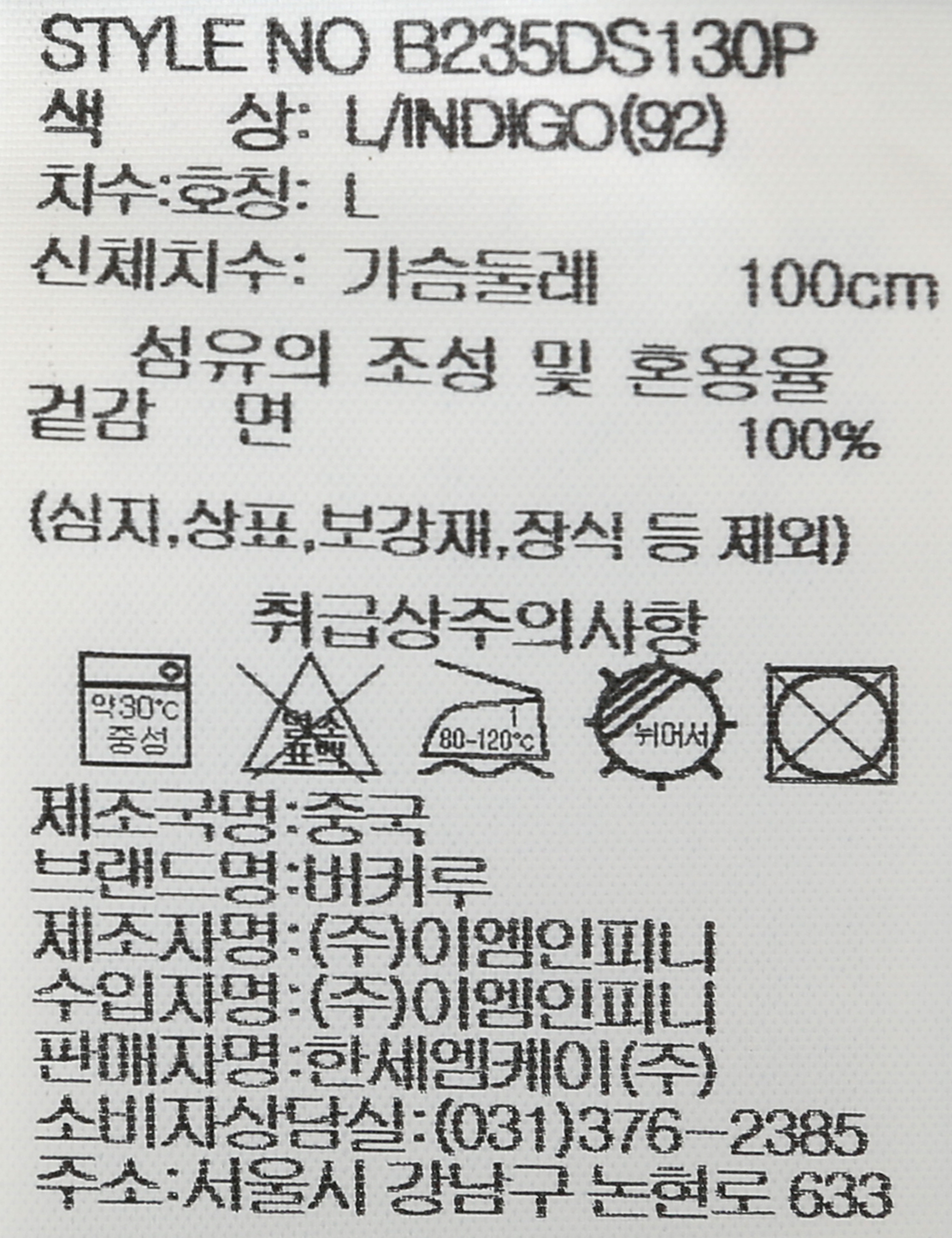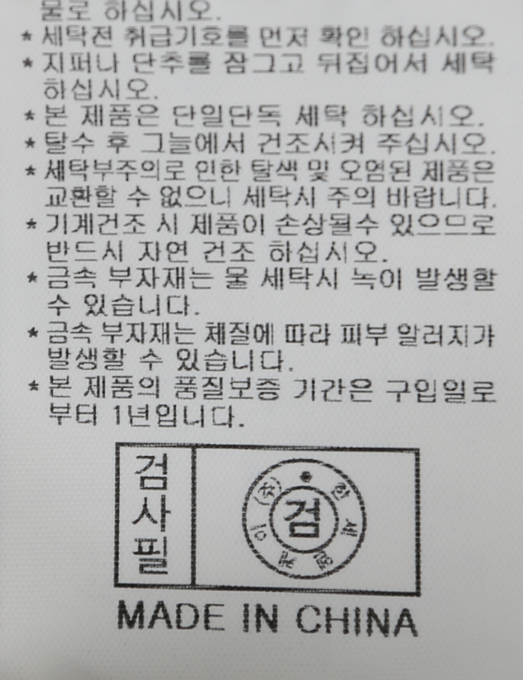| 세탁방법 및 취급시 주의사항 | 중성세제로 단 시간내에 세탁하십시오.(케어라벨참고) |