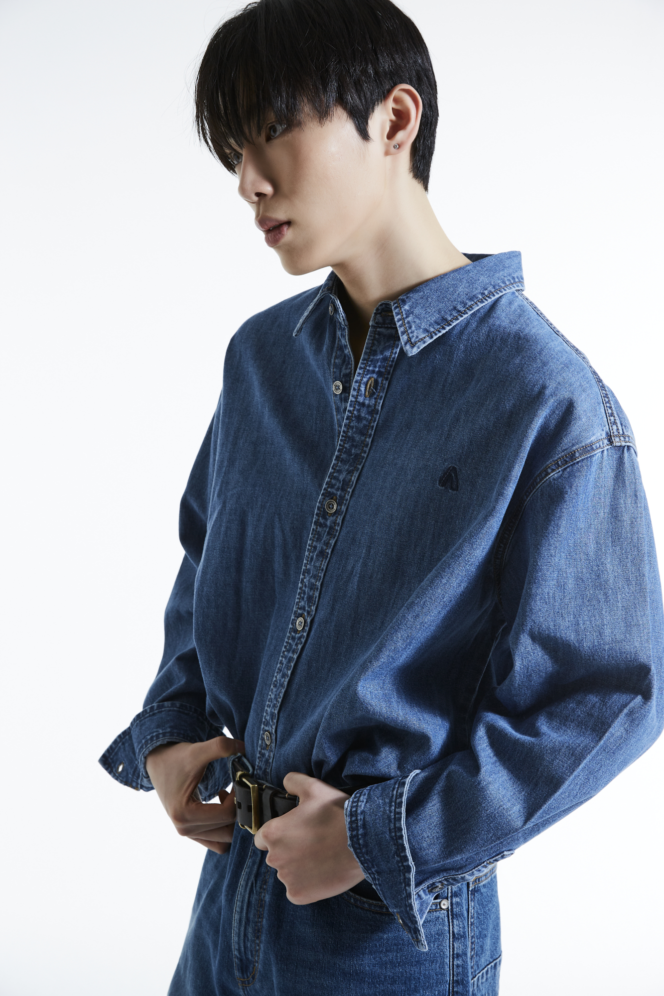 루즈한 핏감의 셔츠로 버커루 NEW 로고 자수로 포인트를 준 데님 셔츠.