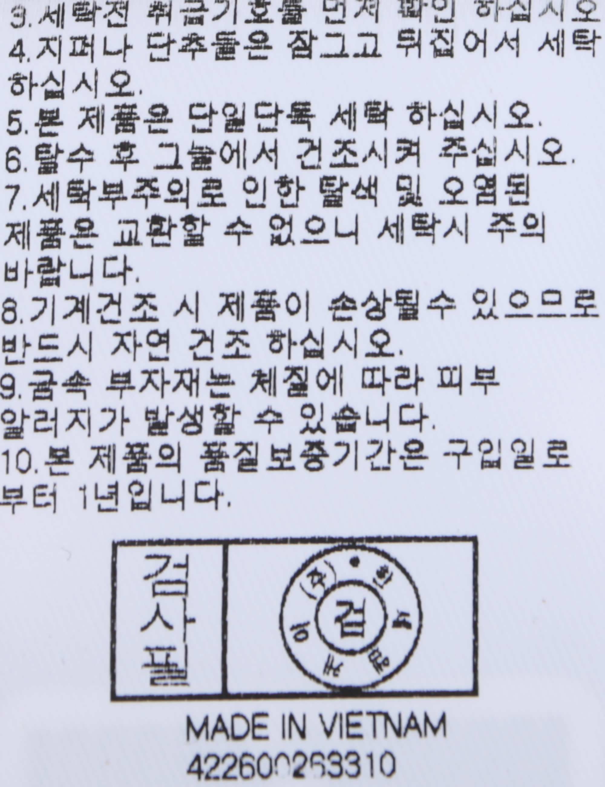 | 세탁방법 및 취급시 주의사항 | 중성세제로 단 시간내에 세탁하십시오.(케어라벨참고) |