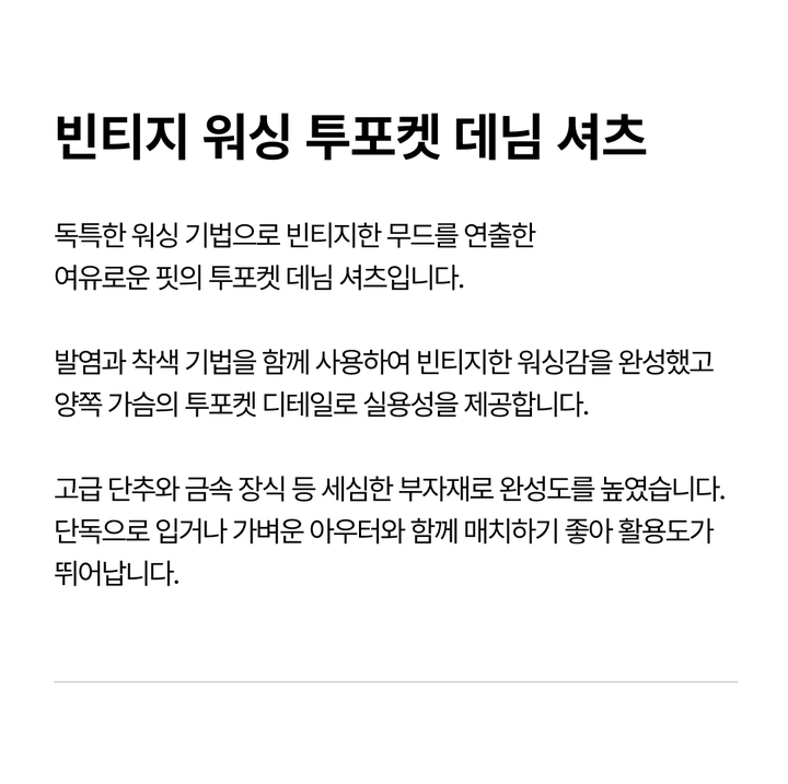 상품명 빈티지 워싱 투포켓 데님 셔츠(B265DS201P)