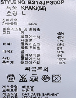 브랜드 홈 바로가기| 제품소재 | [겉감]면43% 폴리에스터40% 나일론17% [배색1]폴리에스터95% 폴리우레탄5% [배색2]면96% 폴리우레탄4% [안감]폴리에스터100% [충전재]폴리에스터100% |