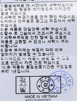 | 세탁방법 및 취급시 주의사항 | 본 제품은 손세탁 하십시오.(케어라벨참고) |