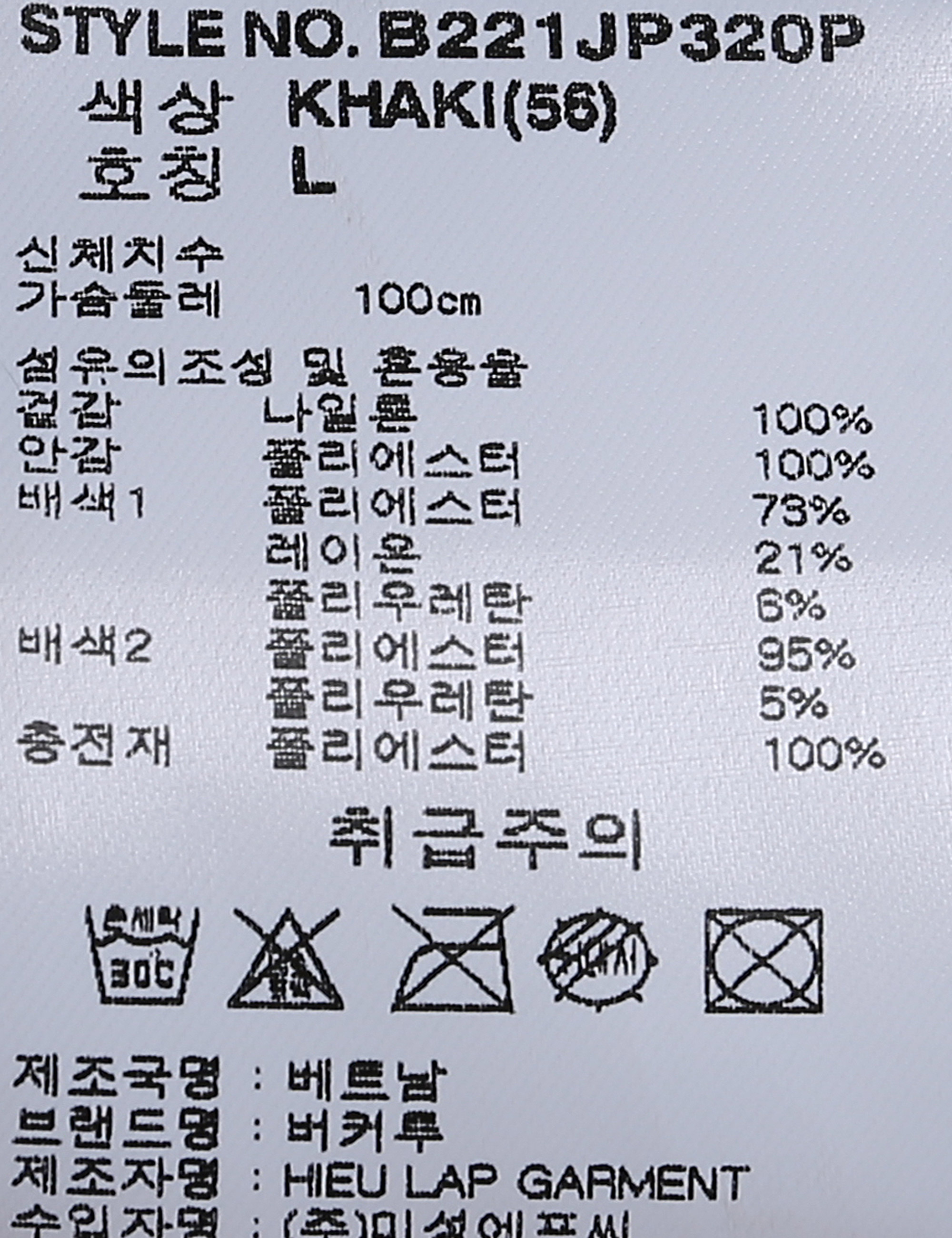 제품소재 [겉감]나일론100% [안감]폴리에스터100% [배색1]폴리에스터73% 레이온21% 폴리우레탄6% [배색2]폴리에스터95% 폴리우레탄5% [충전재]폴리에스터100%