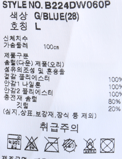 제품소재 [겉감]폴리에스터100% [안감1]나일론100% [안감2]폴리에스터100% [충전재]오리솜털80% 오리깃털20%