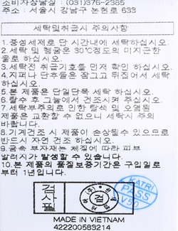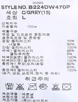 | 세탁방법 및 취급시 주의사항 | 본 제품은 손세탁 하십시오.(케어라벨참고) |