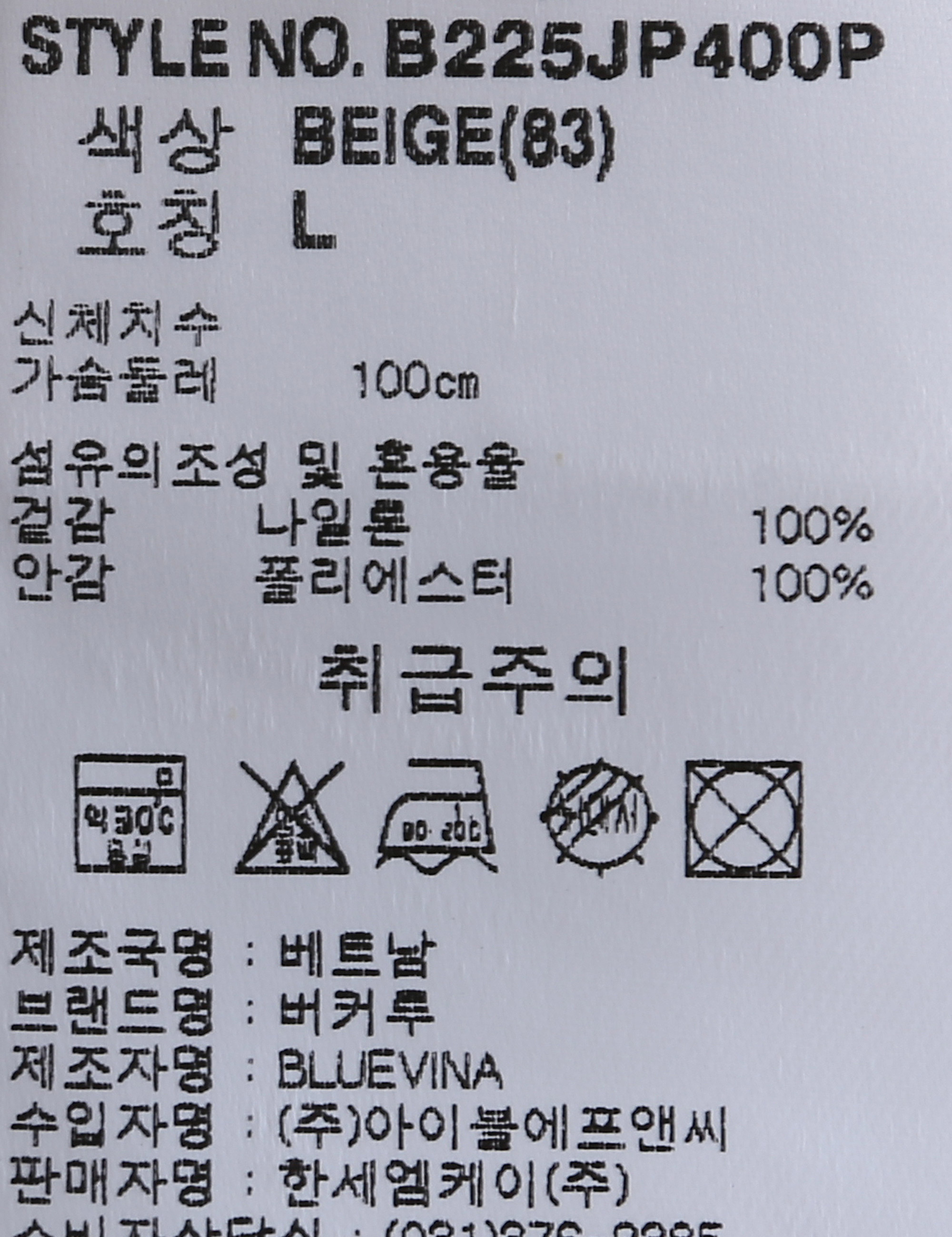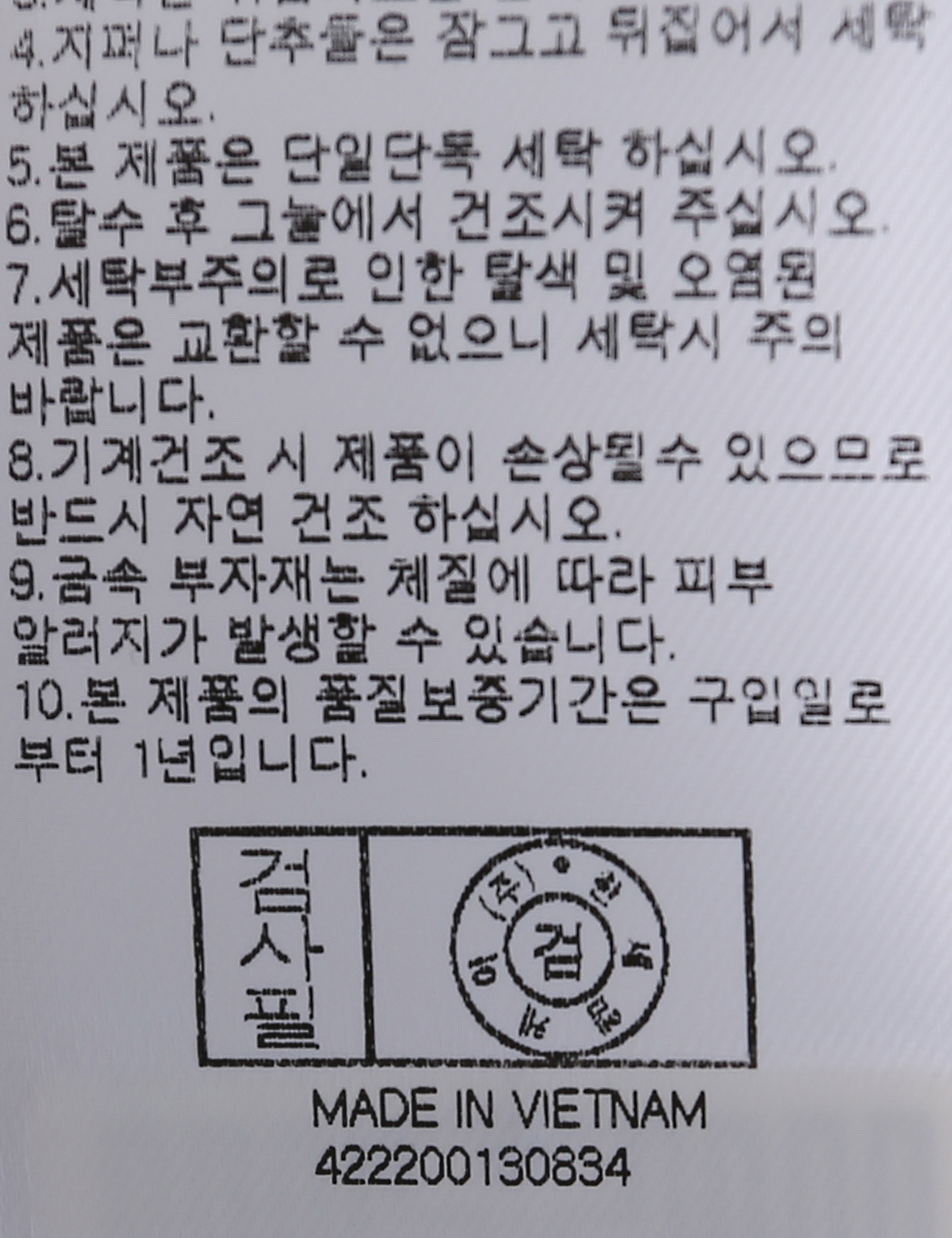 | 세탁방법 및 취급시 주의사항 | 중성세제로 단 시간내에 세탁하십시오.(케어라벨참고) |
