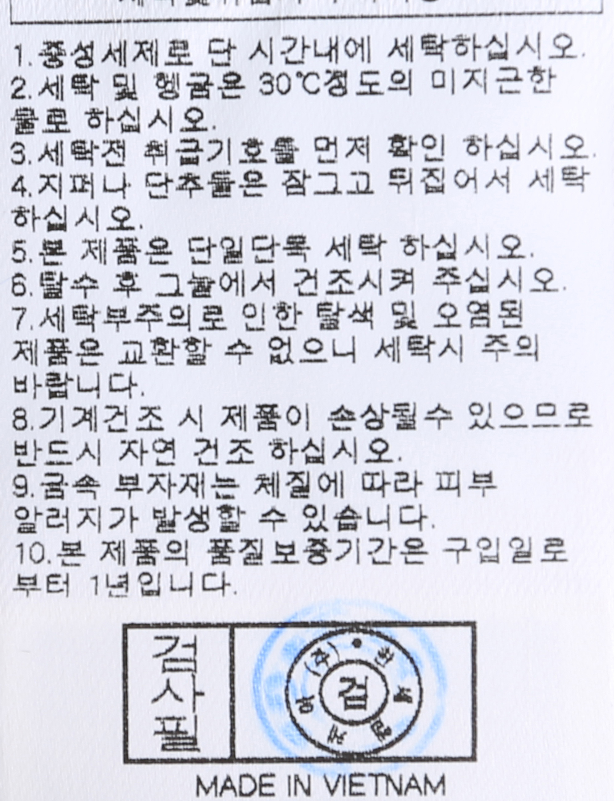 | 세탁방법 및 취급시 주의사항 | 중성세제로 단 시간내에 세탁하십시오.(케어라벨참고) |