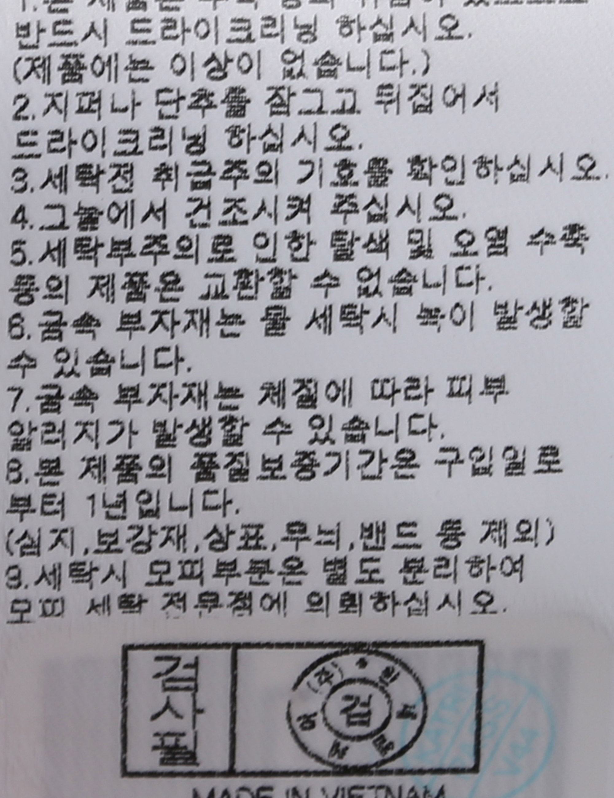 | 세탁방법 및 취급시 주의사항 | 본 제품은 반드시 드라이크리닝 하십시오.(세탁라벨참고) |