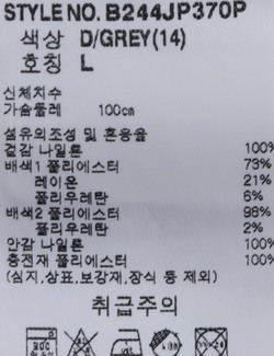 제품소재 [겉감]나일론100% [배색1]폴리에스터73% 레이온21% 폴리우레탄6% [배색2]폴리에스터98% 폴리우레탄2% [안감]나일론100% [충전재]폴리에스터100%