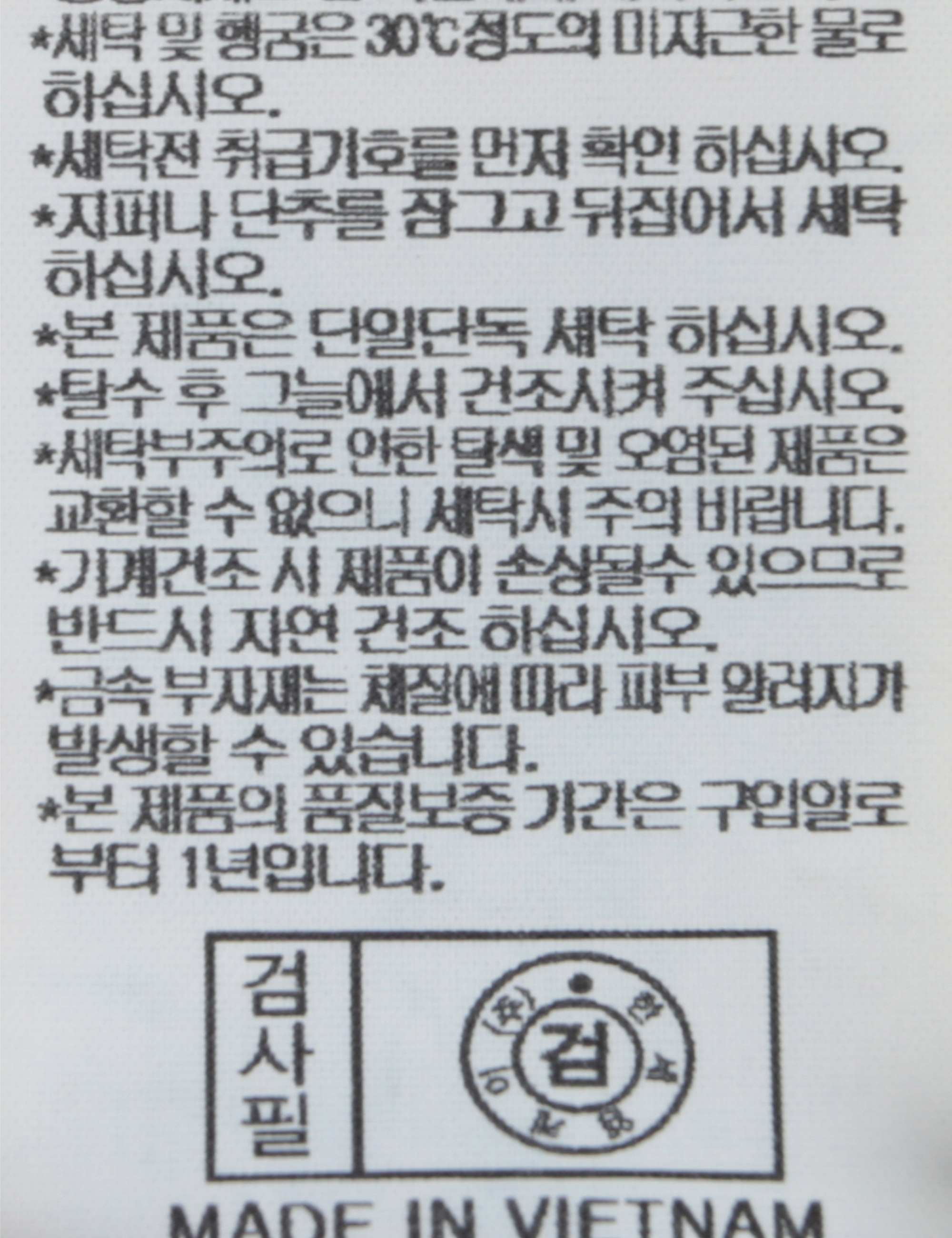 | 세탁방법 및 취급시 주의사항 | 중성세제로 단 시간내에 세탁하십시오.(케어라벨참고) |