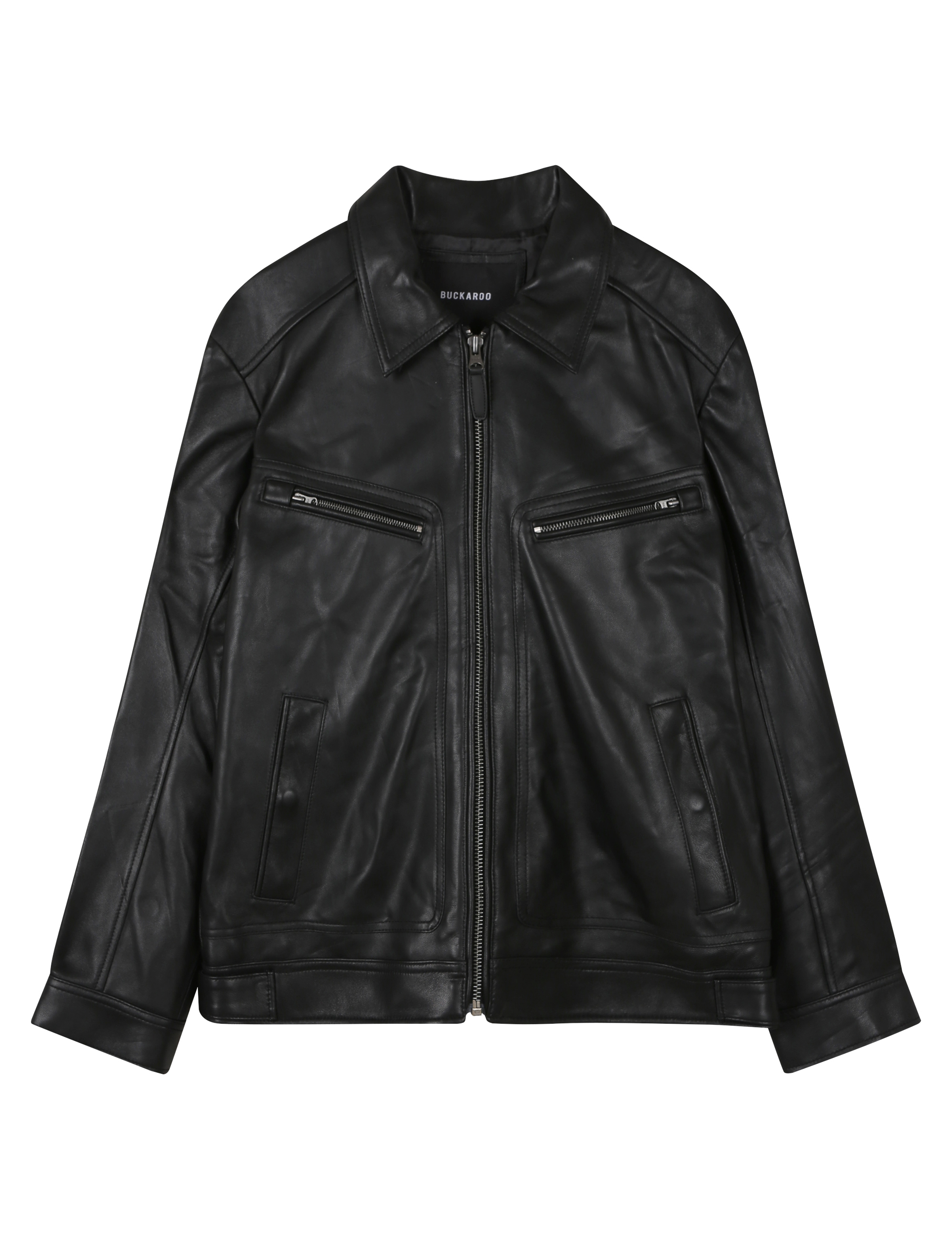 금속 지퍼포켓으로 포인트를 준 스탠다드핏의 가죽 자켓