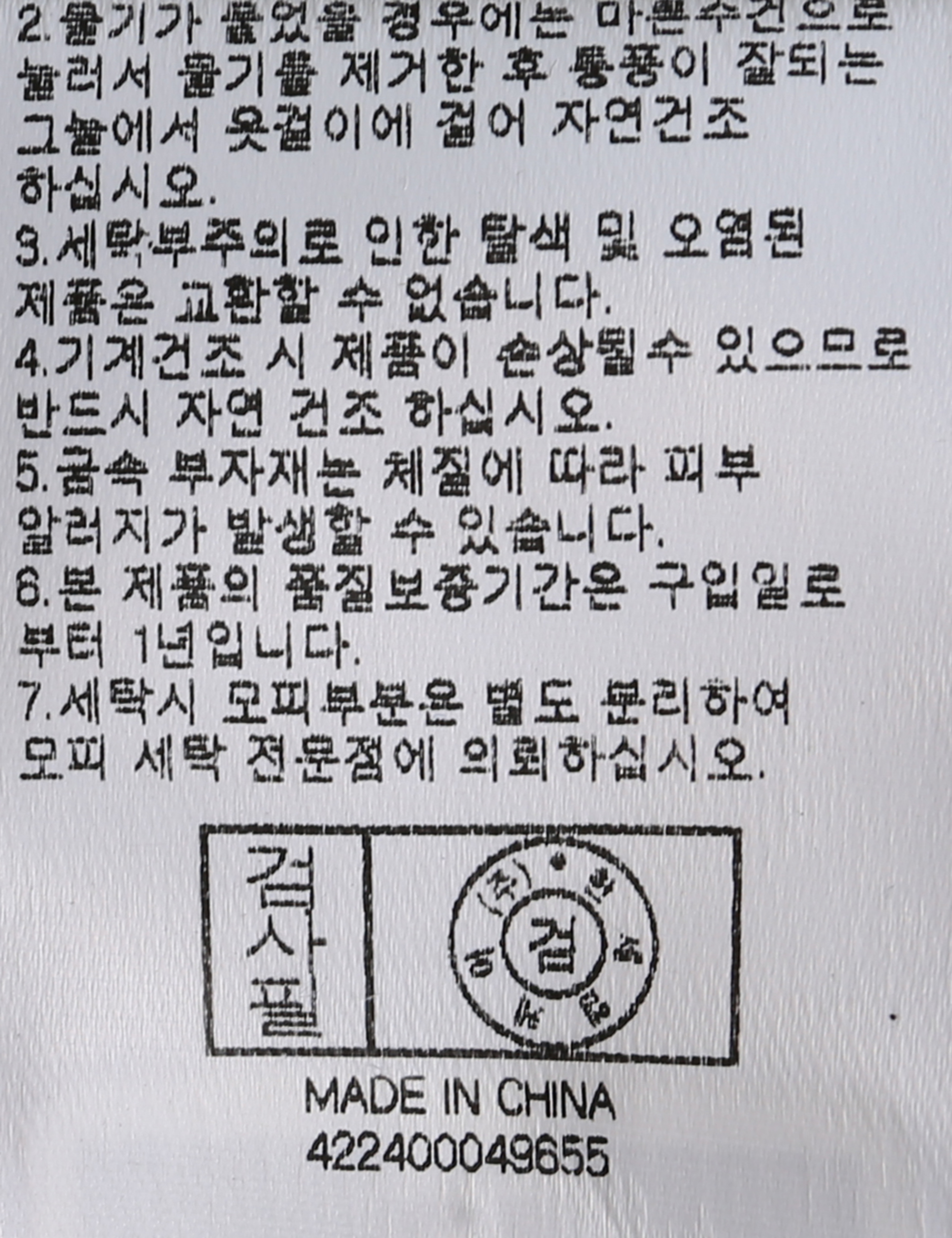 | 세탁방법 및 취급시 주의사항 | 세탁 불가 상품입니다.(세탁라벨참고) |