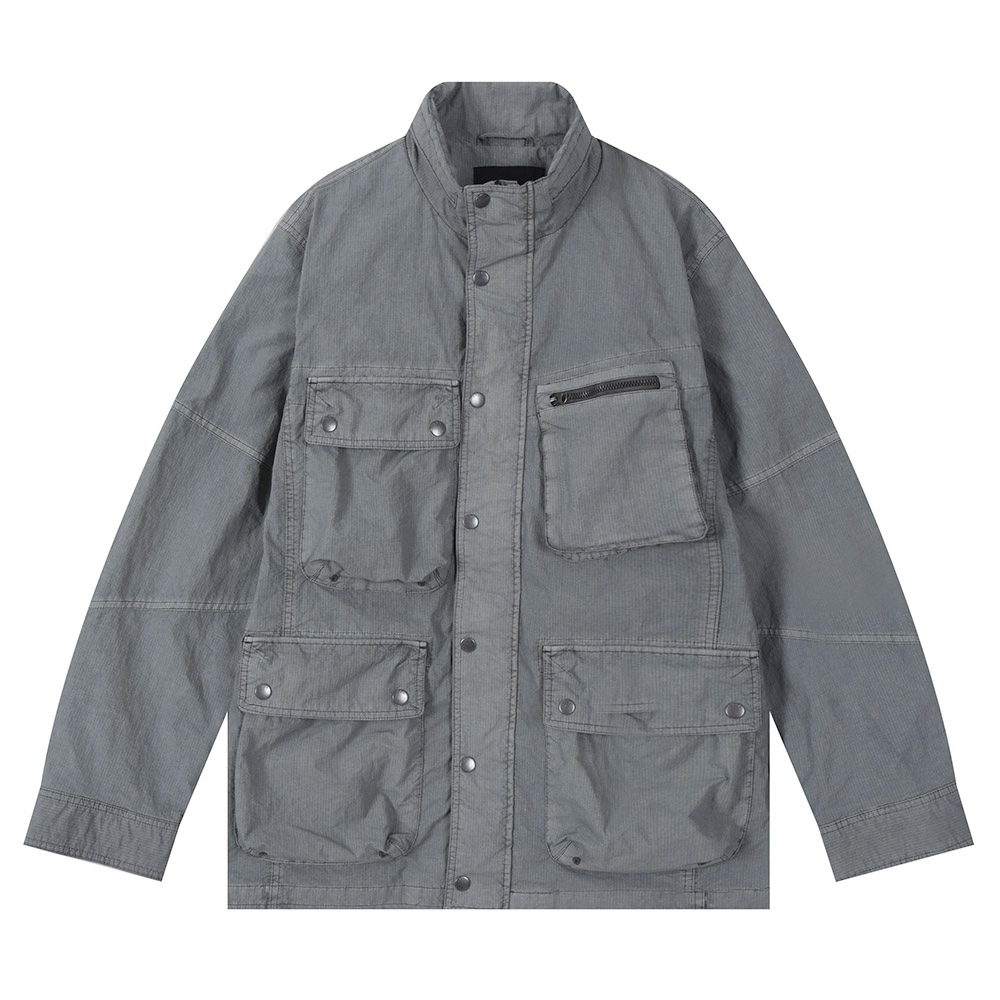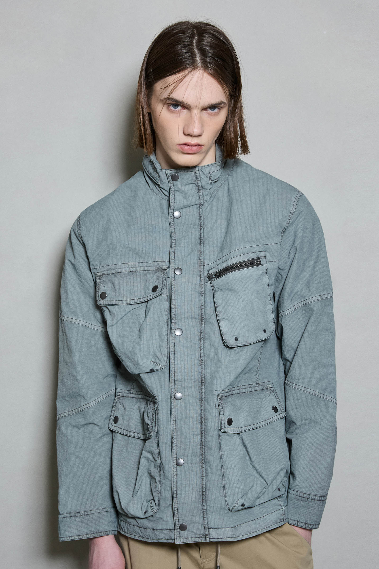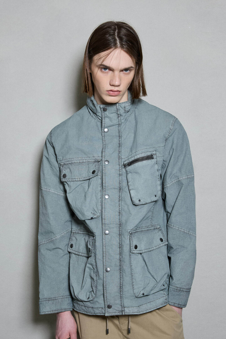 *립스탑 조직의 나일론 소재를 가먼트다잉하여 빈티지한 느낌을 살린 4포켓 디테일의 하이넥 야상 점퍼