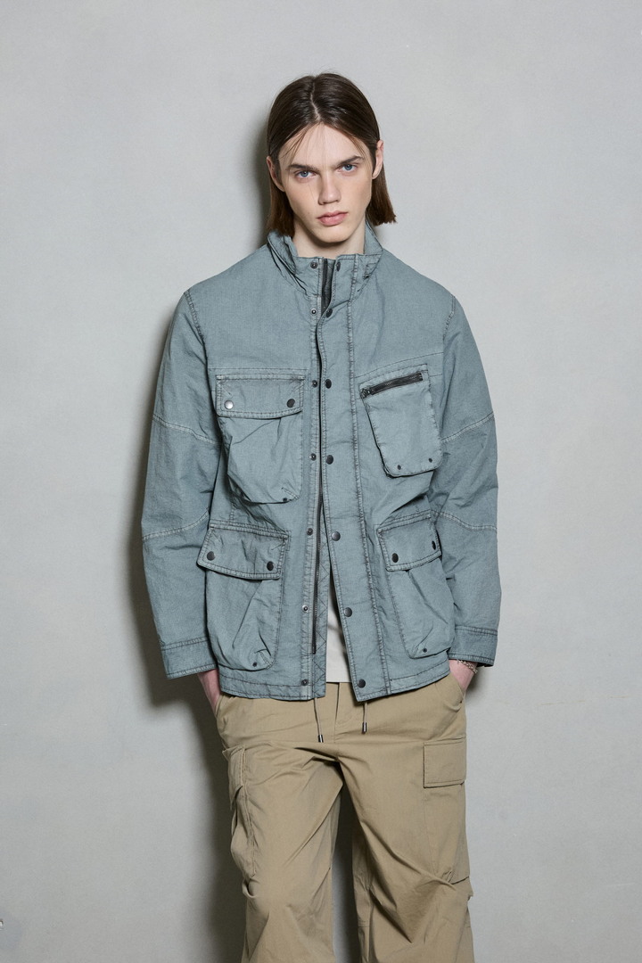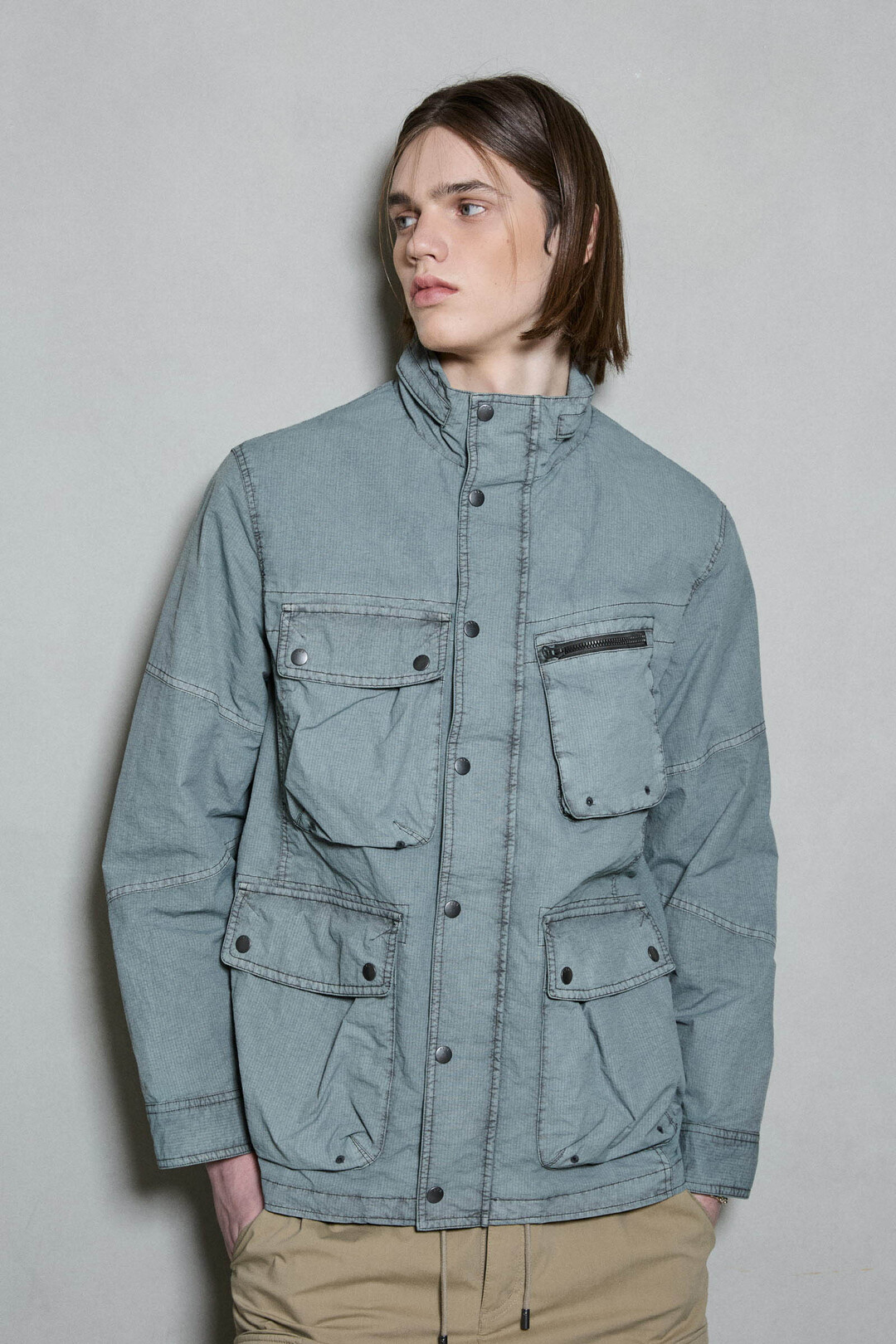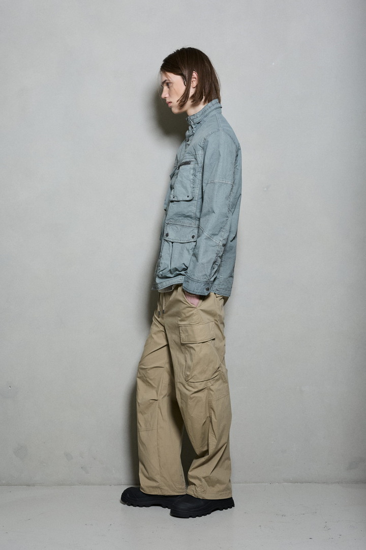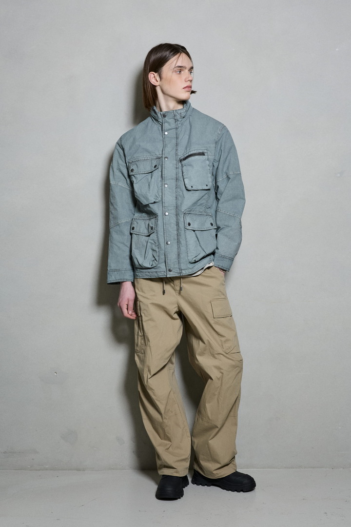 *립스탑 조직의 나일론 소재를 가먼트다잉하여 빈티지한 느낌을 살린 4포켓 디테일의 하이넥 야상 점퍼