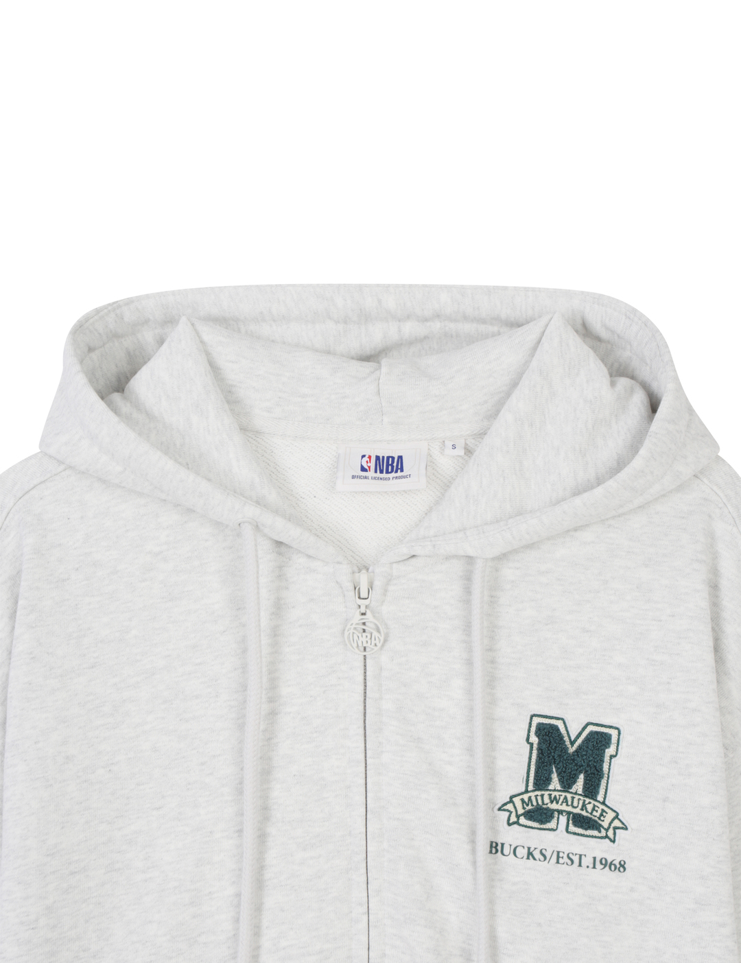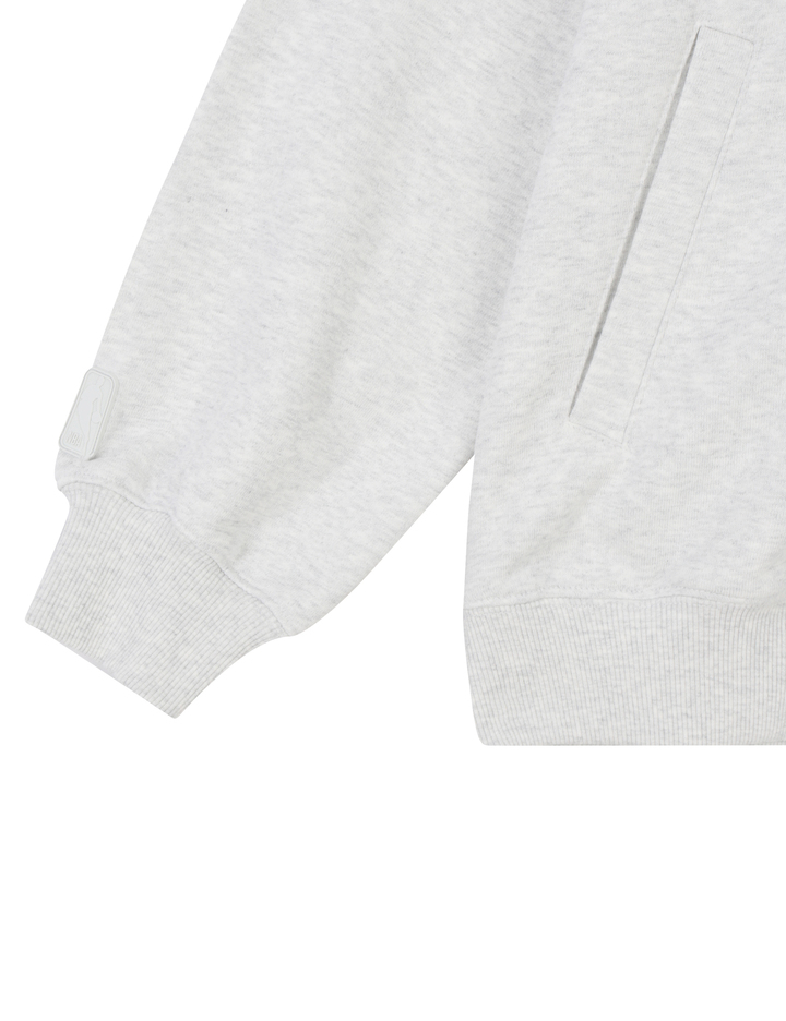 가슴에 NBA 팀을 상징하는 알파벳을 활용한 부클와펜으로 포인트와 소매단에 시그니쳐 로고맨 와펜을 넣어 퀄리티를 높임.