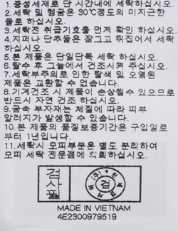 | 세탁방법 및 취급시 주의사항 | 본 제품은 손세탁 하십시오.(케어라벨참고) |
